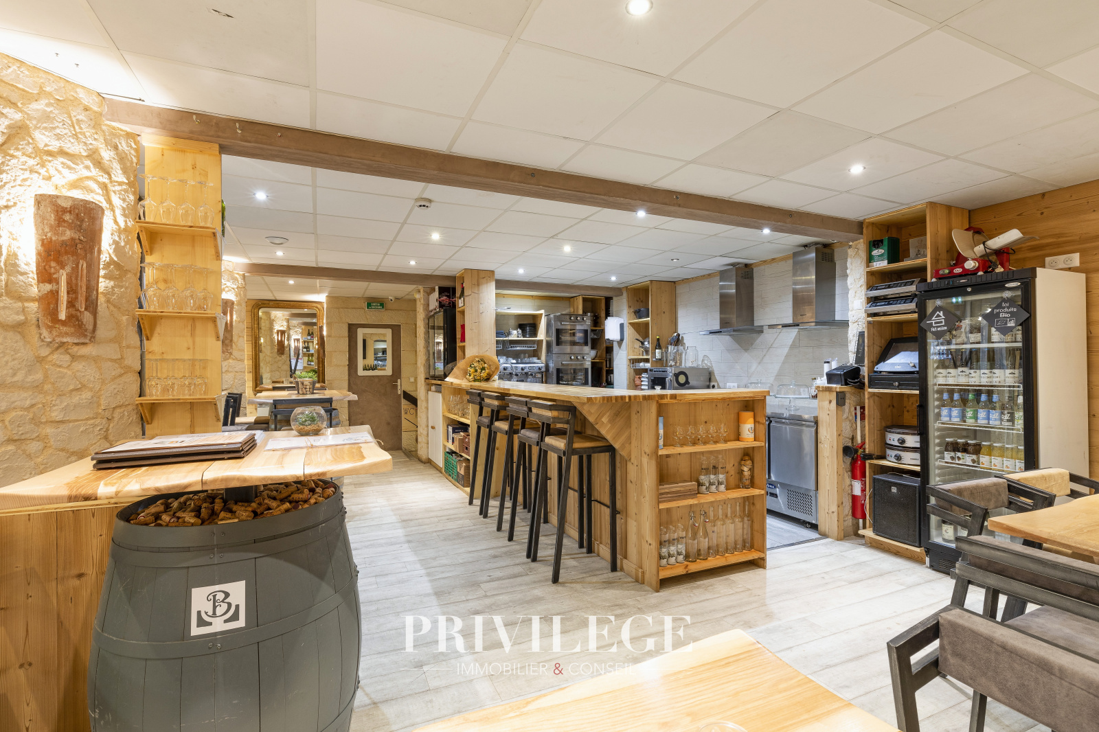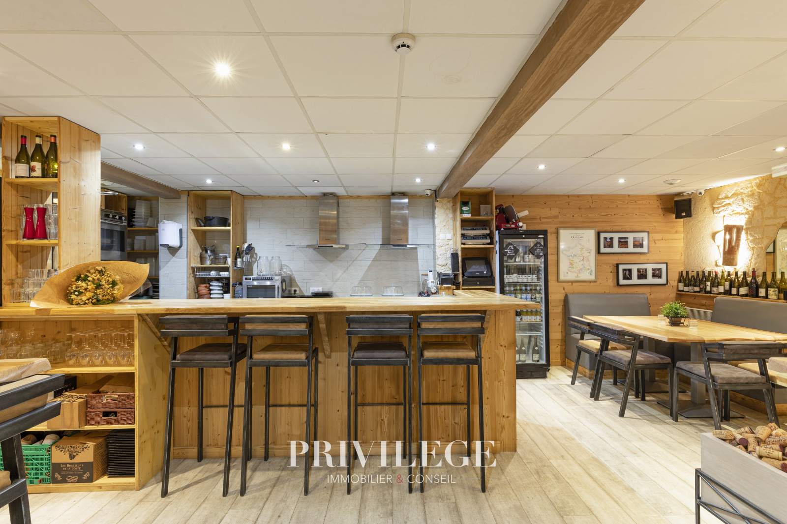 Au 1er niveau, une salle de 30 places assises + 4 au comptoir, une cuisine et 1 toilette pour une superficie de 60m2.