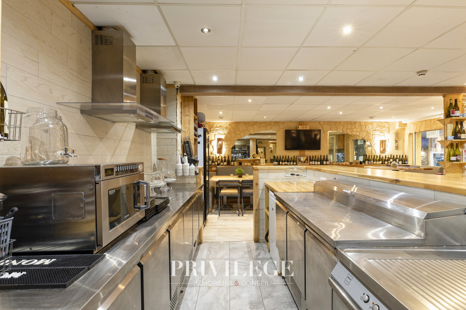 Cuisine professionnelle toute neuve aux normes et toute équipée, crêpière – four – plaque – micro-ondes etc…..Réalisant également de la vente à emporter – Licence 4 en location.