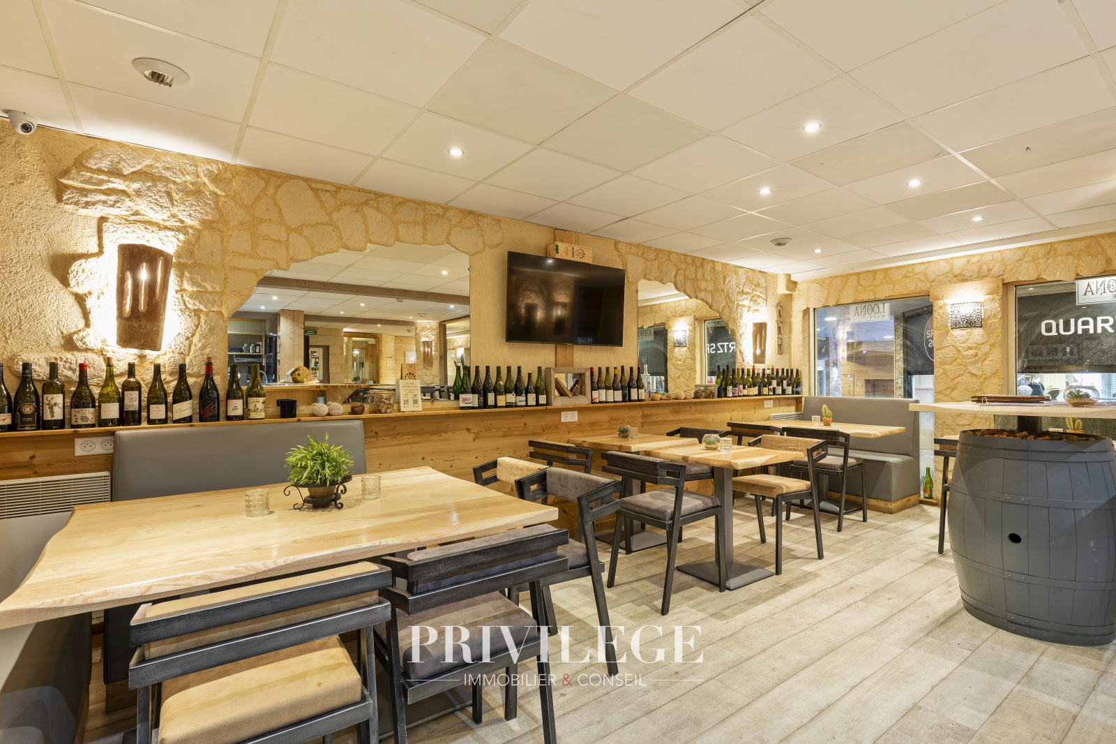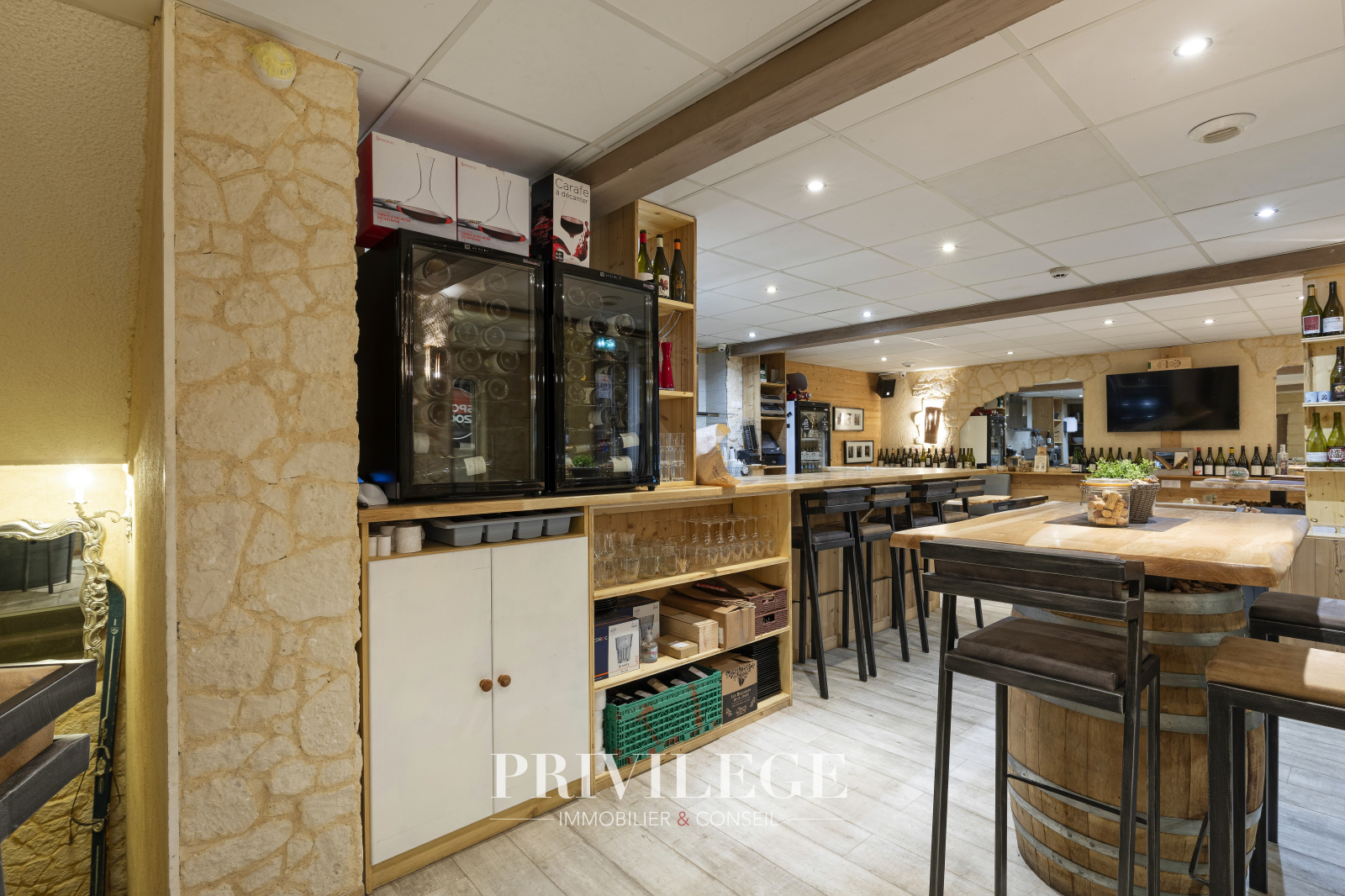 Au sous-sol, 2 réserves de 8m2 + une de 5m2 avec cave et un espace détente entièrement équipé avec salle d’eau sur une surface totale de 74m2, complète cet établissement.