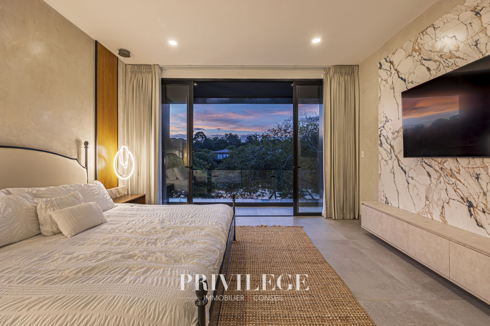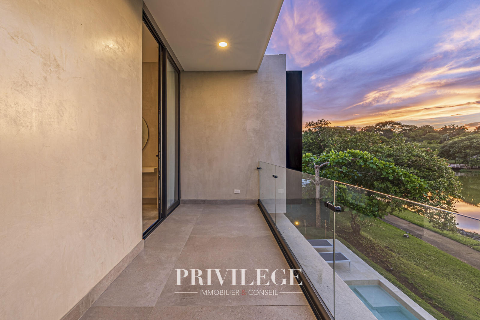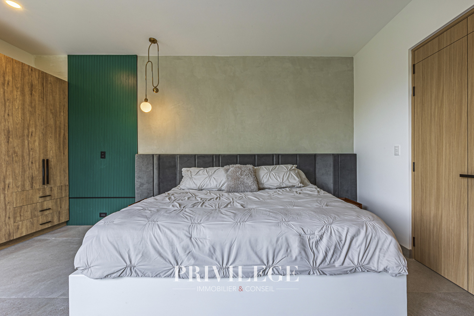 De grandes fenêtres et des portes coulissantes en verre offrent une vue imprenable sur le lac tranquille adjacent, créant pour l’utilisateur une connexion constante avec la nature. La résidence dispose d'1 chambre principale avec une salle de bain attenante, de 2 chambres secondaires et d’un espace bureau polyvalent. Tout cela assure la commodité pour les résidents et les invités.