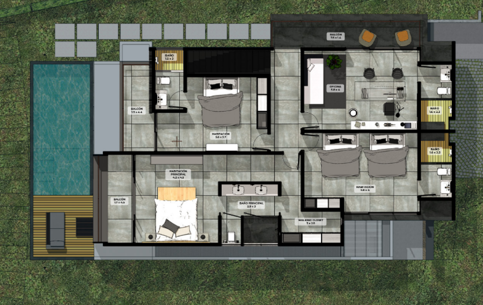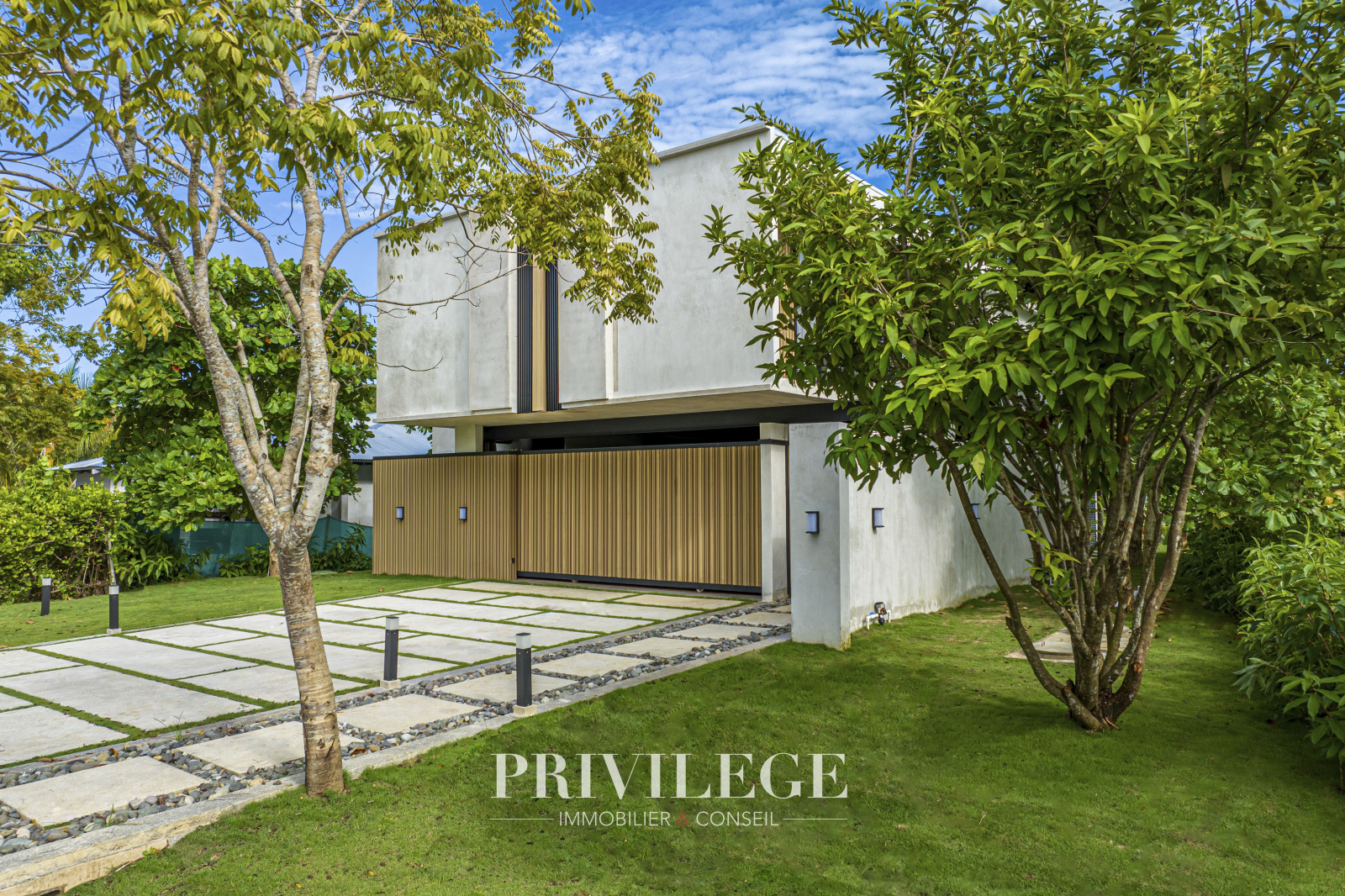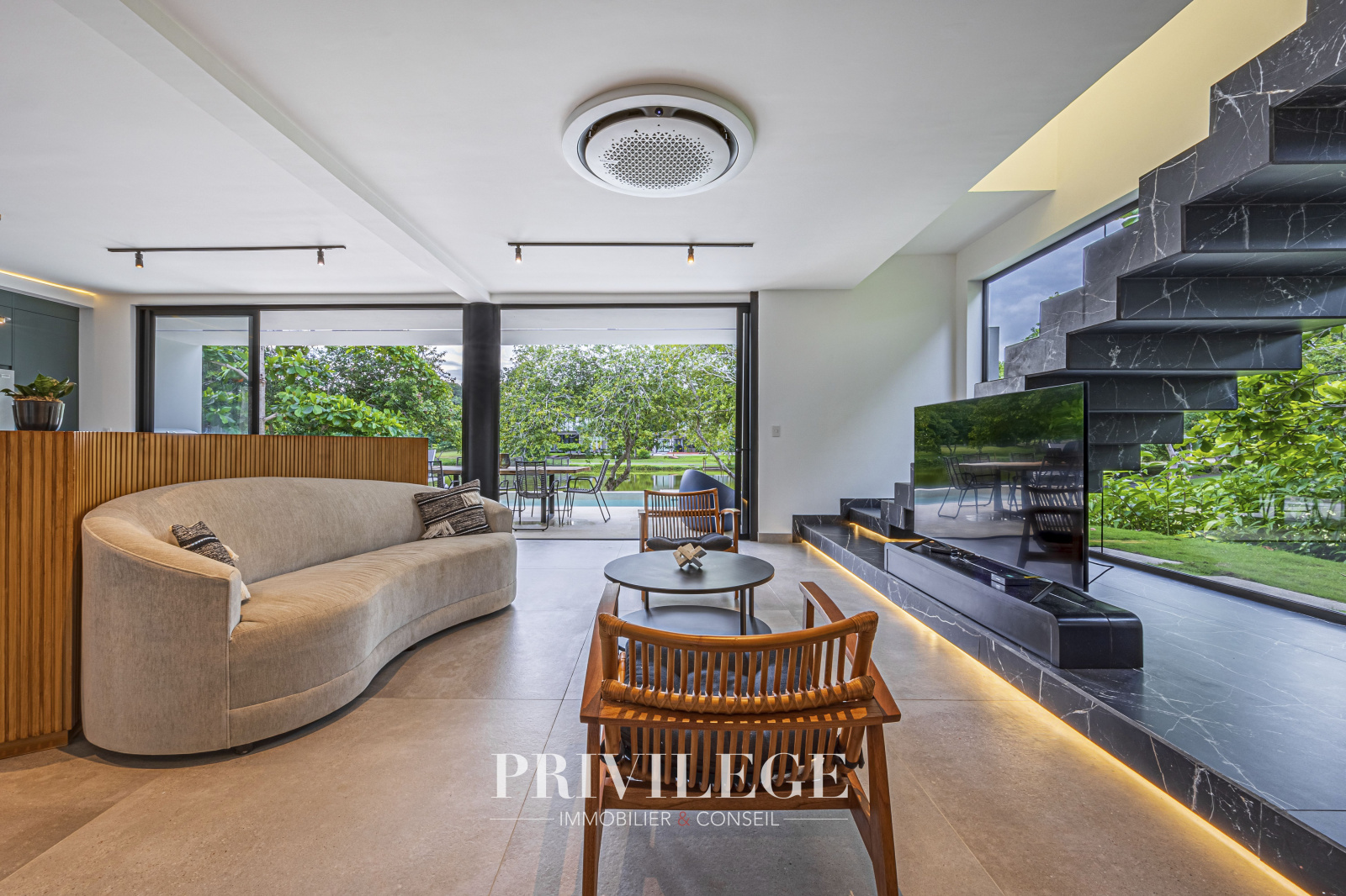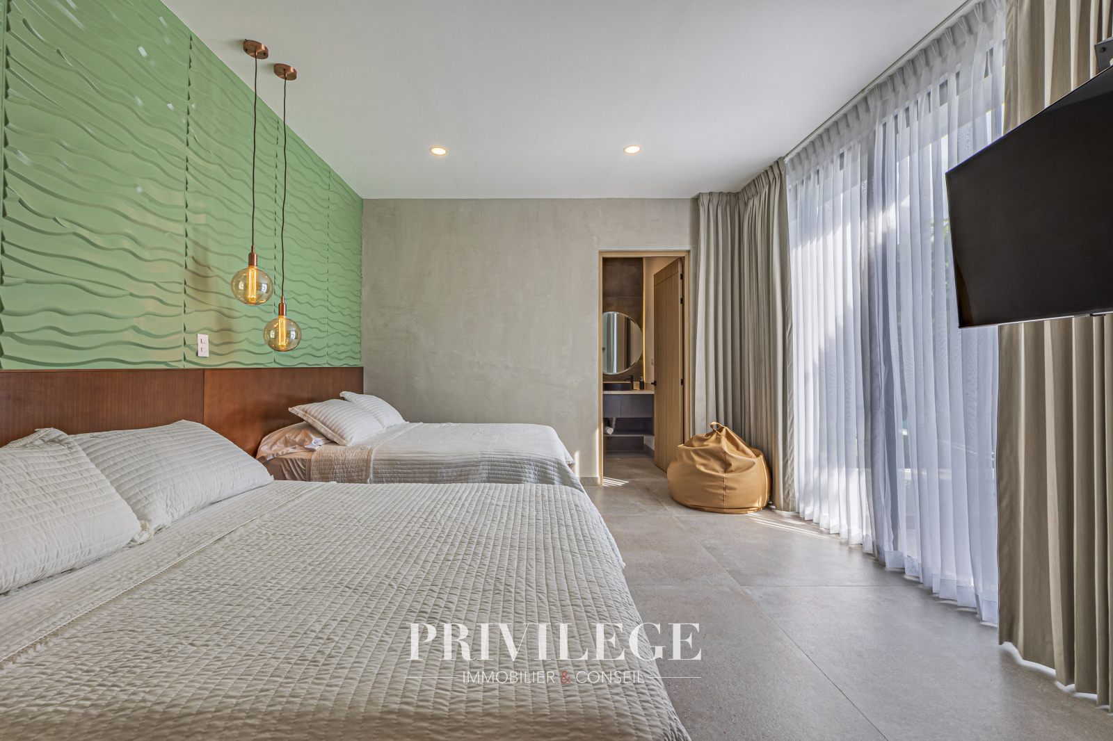 De grandes fenêtres et des portes coulissantes en verre offrent une vue imprenable sur le lac tranquille adjacent, créant pour l’utilisateur une connexion constante avec la nature. La résidence dispose d'1 chambre principale avec une salle de bain attenante, de 2 chambres secondaires et d’un espace bureau polyvalent. Tout cela assure la commodité pour les résidents et les invités.