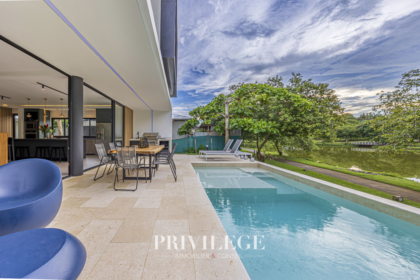 Un concept de maison de plage contemporaine ouverte rassemble la cuisine et la salle familiale pour fournir un centre central pour les rassemblements et la connexion. La cuisine, équipée d’appareils haut de gamme, mène à une terrasse pour les repas en plein air. Une salle de télévision séparée offre une retraite confortable. Le point culminant est la généreuse piscine dans l’arrière-cour, entourée de jardins luxuriants. C’est l’endroit idéal pour se détendre et se rafraîchir sous le soleil du Costa Rica. Mais si vous regardez au-delà de la piscine, vous trouverez une atmosphère tranquille avec la vue apaisante sur l’eau du lac.