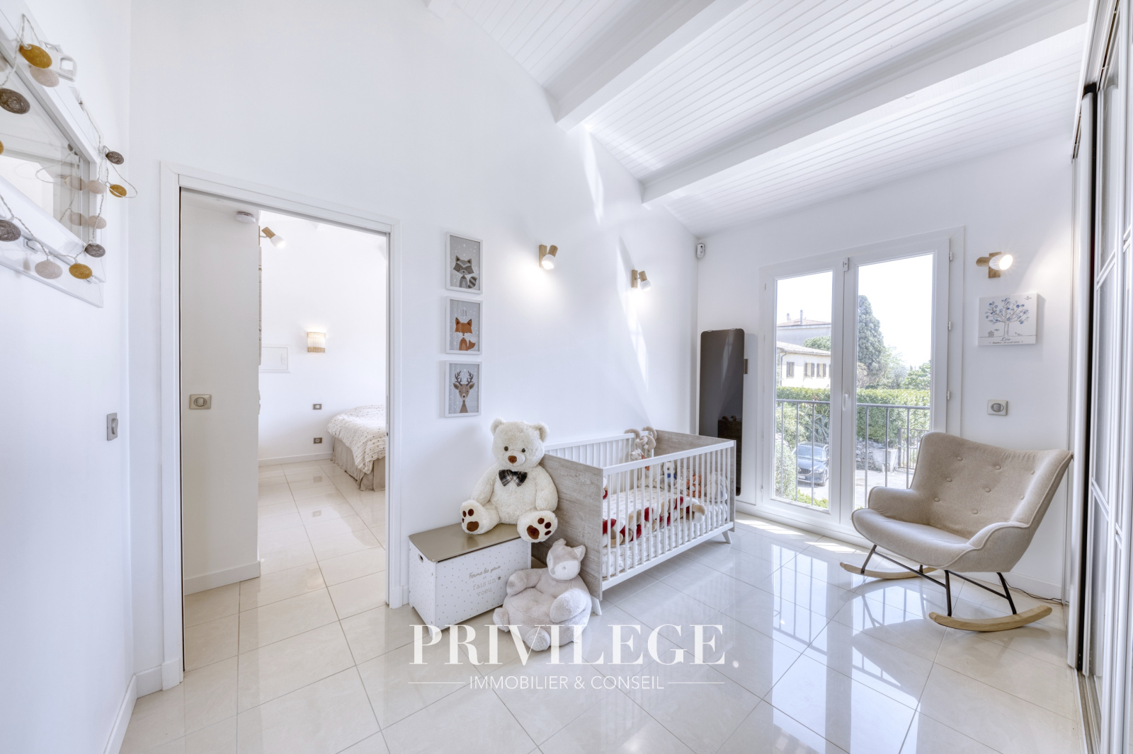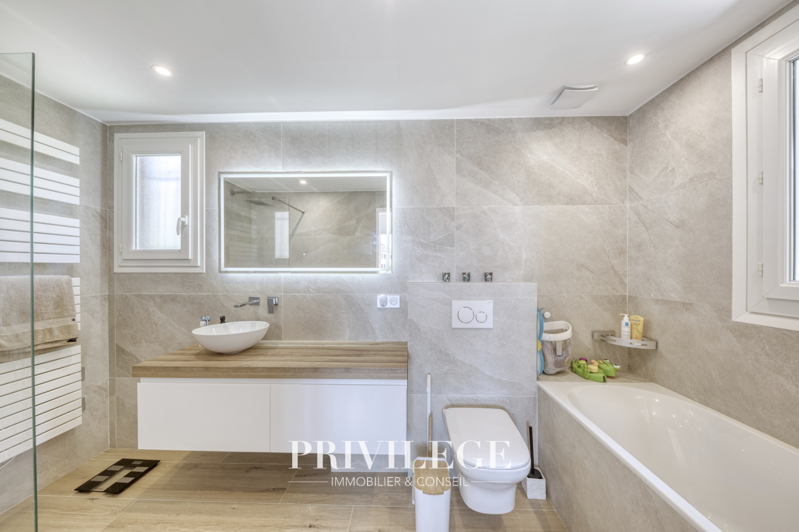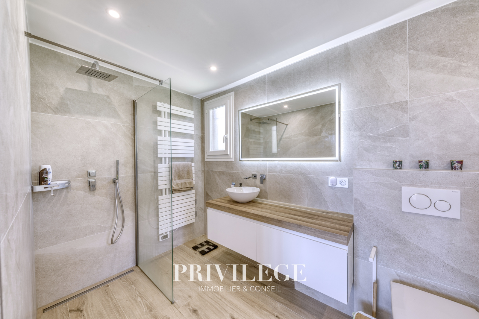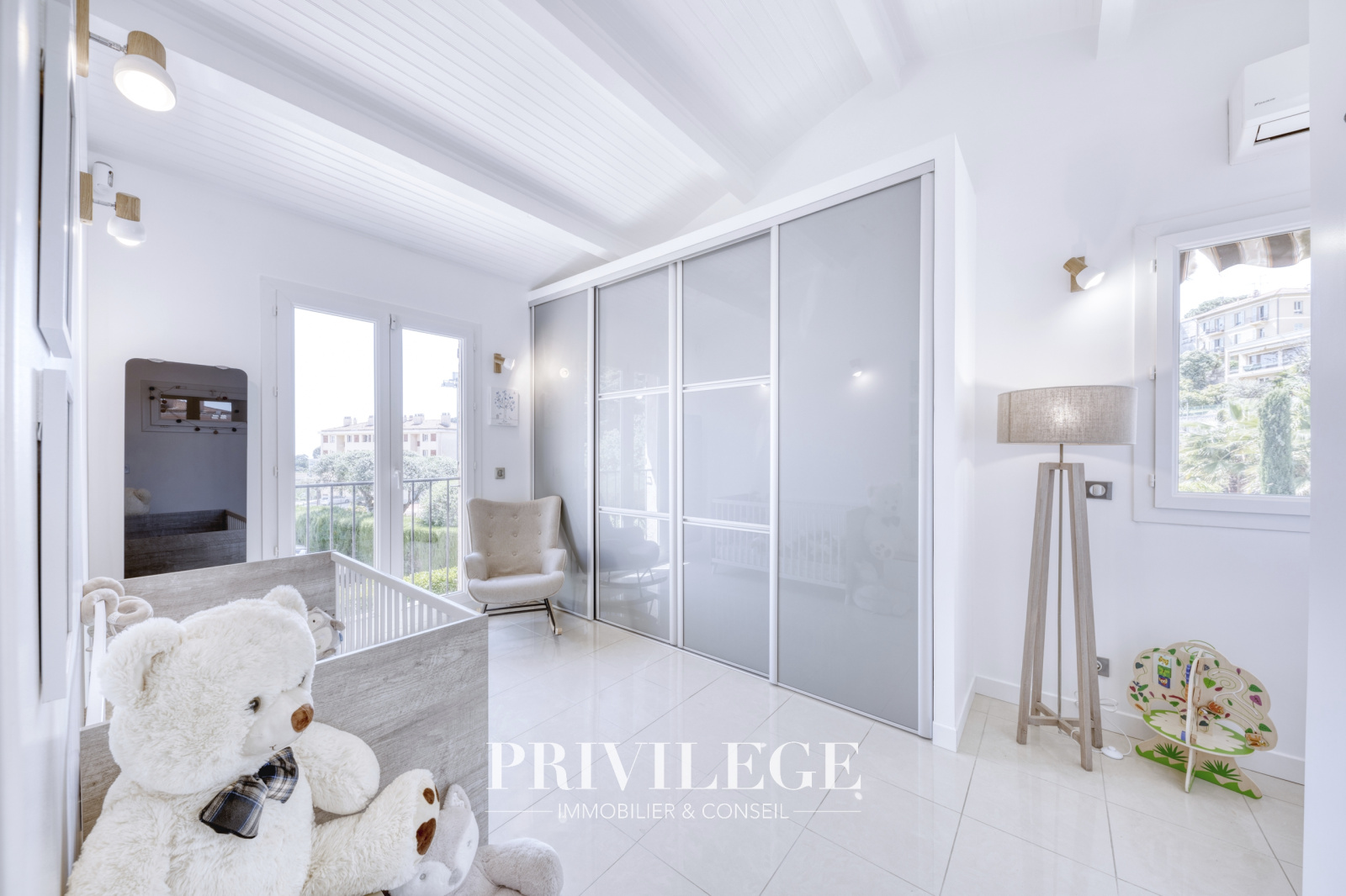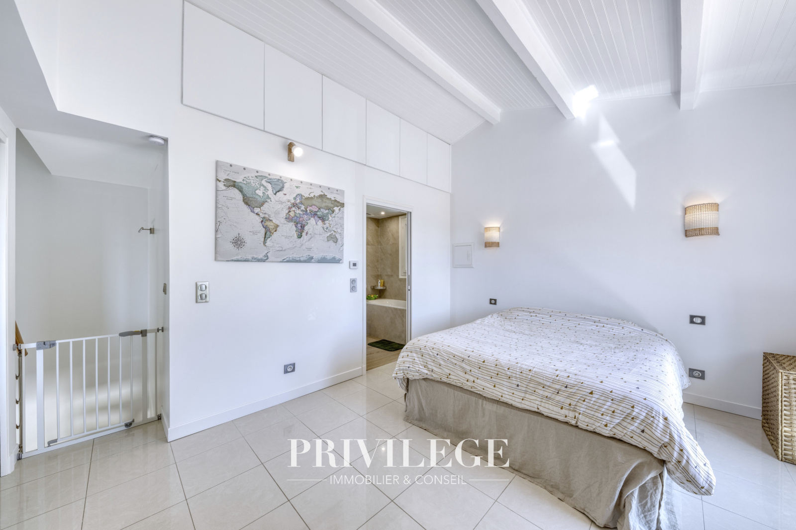 A l’étage, vous trouverez deux chambres lumineuses dont une belle suite parentale avec salle de bain où depuis son balcon, vous apercevrez la mer.