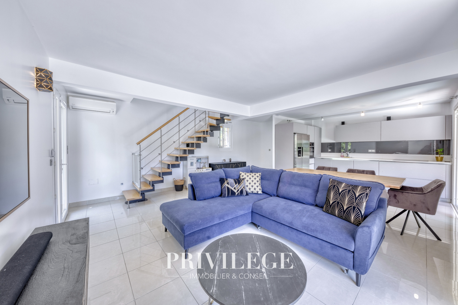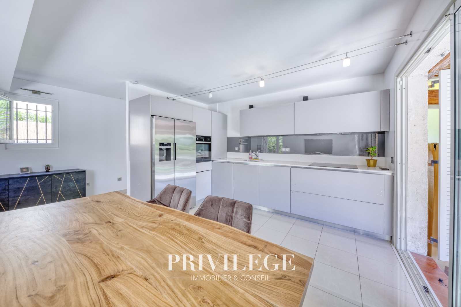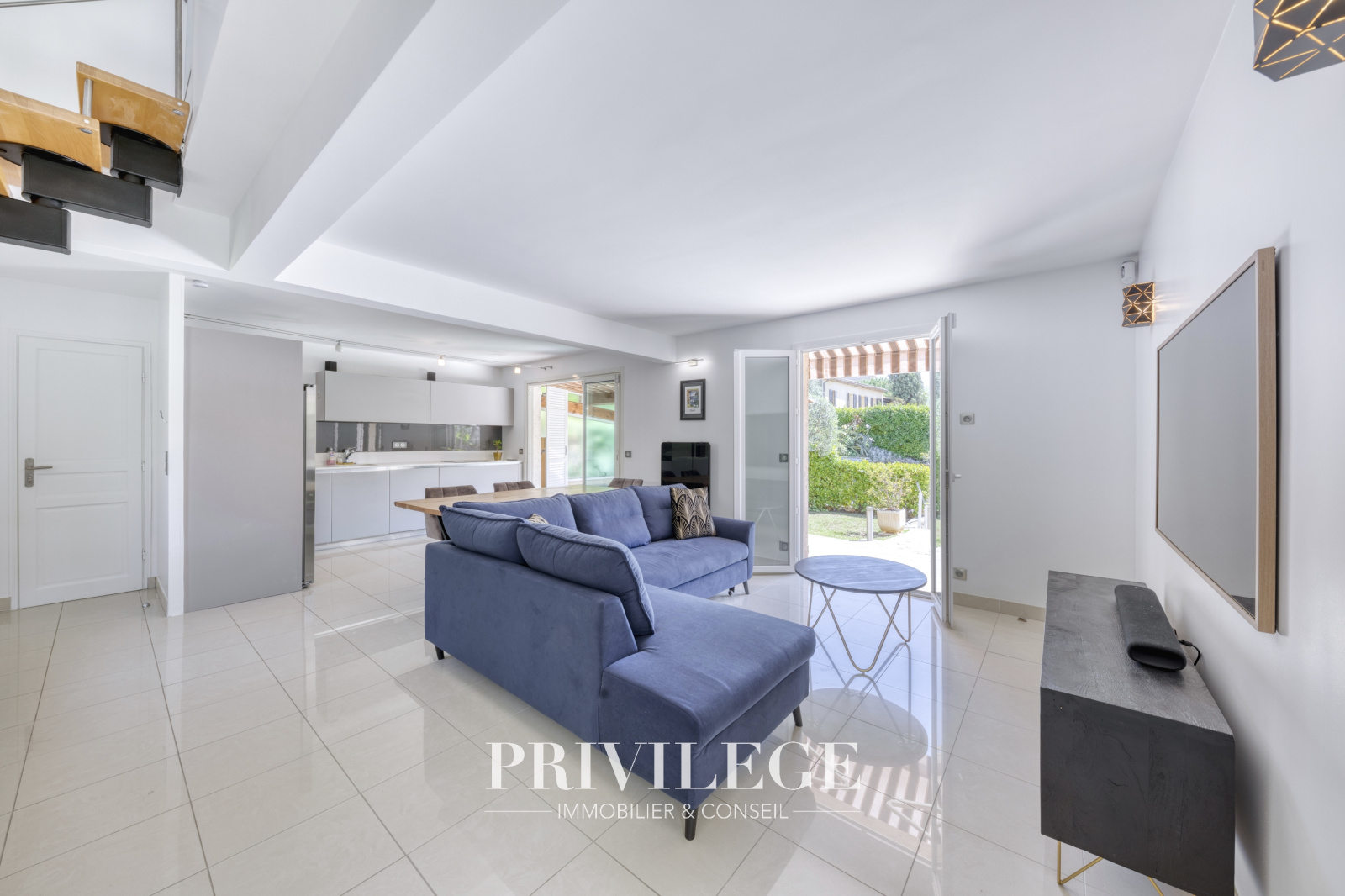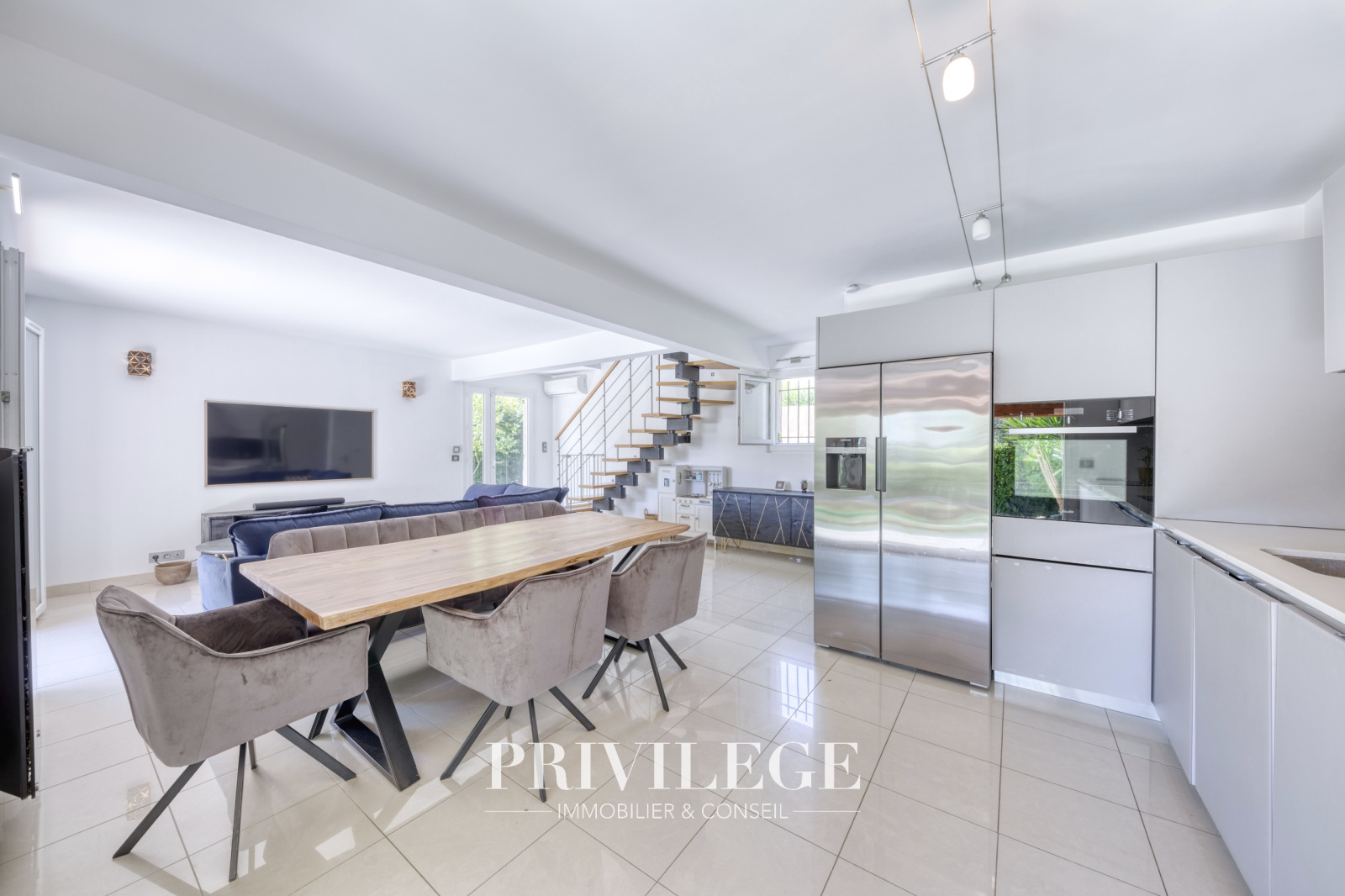 Au rez-de-jardin, un vaste séjour/salle à manger avec une cuisine ouverte équipée donnant sur une très belle terrasse semi ombragée de 35 m² et un toilette invité.