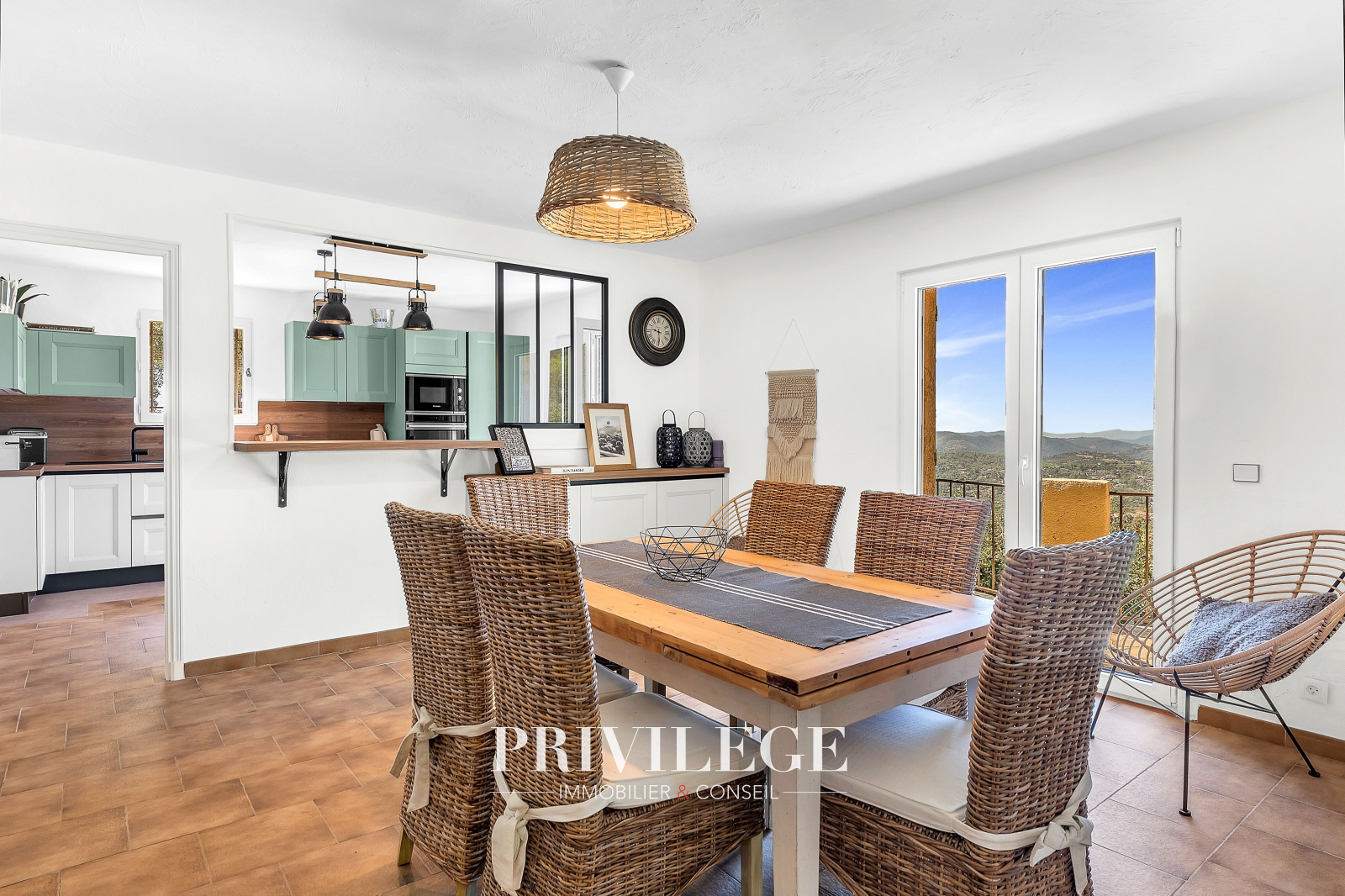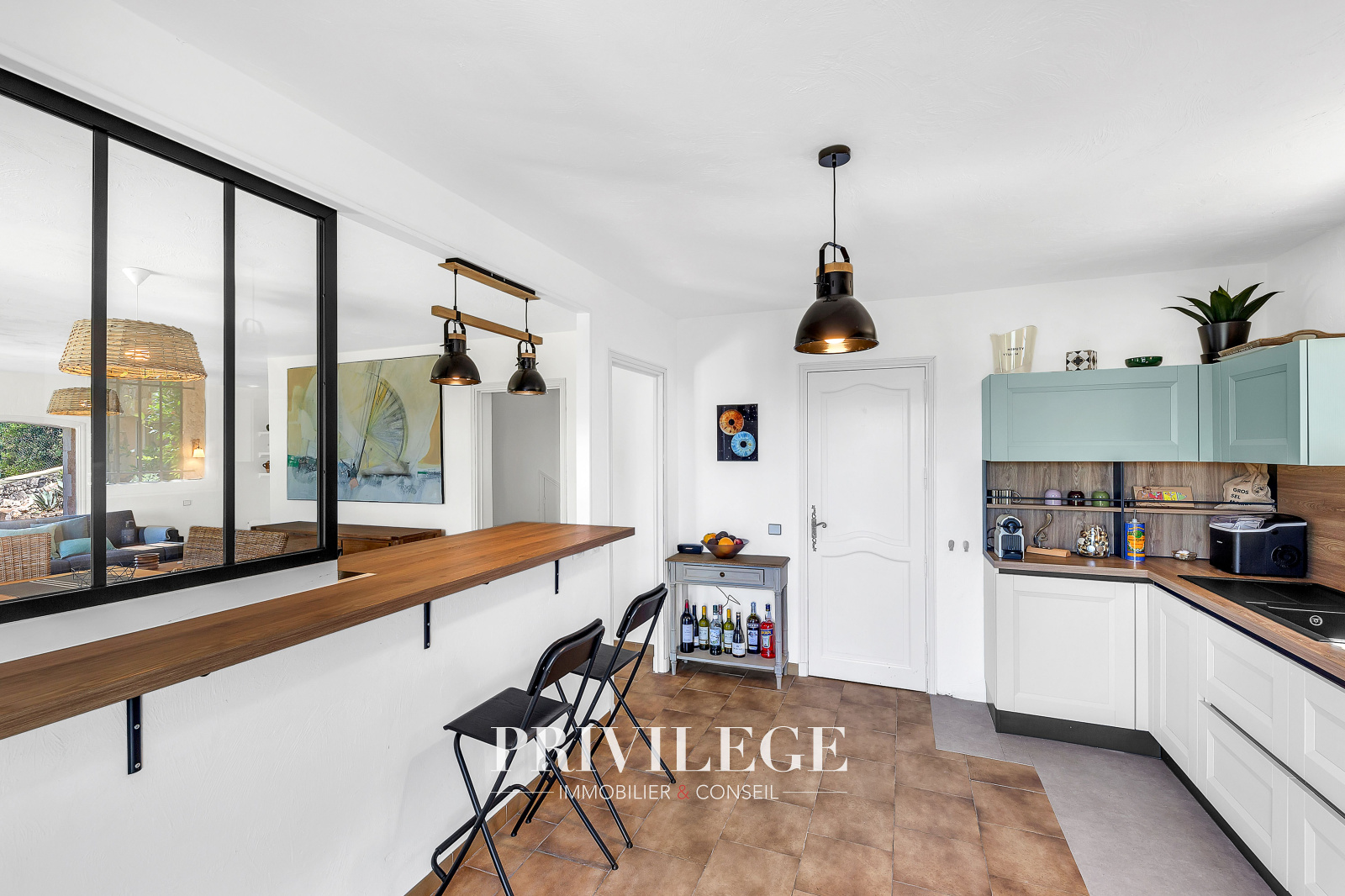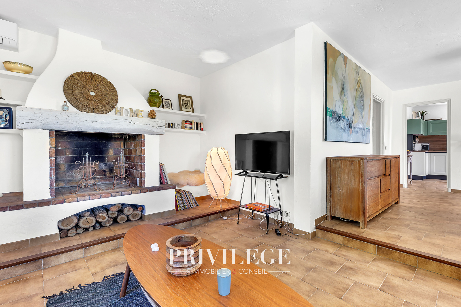 Au rez-de-jardin : Cuisine semi-ouverte moderne donnant sur un séjour lumineux. Coin salon chaleureux avec cheminée. Toilettes invités. Bureau ou 4e chambre avec salle d’eau privative