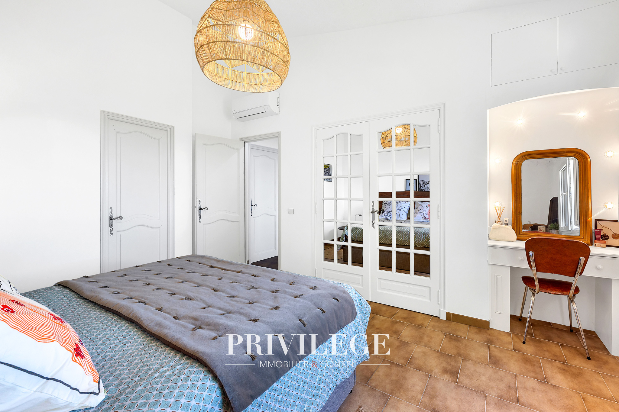 À l’étage : 3 grandes chambres exposées plein sud avec rangements intégrés. Spacieuse salle de bain/douche.