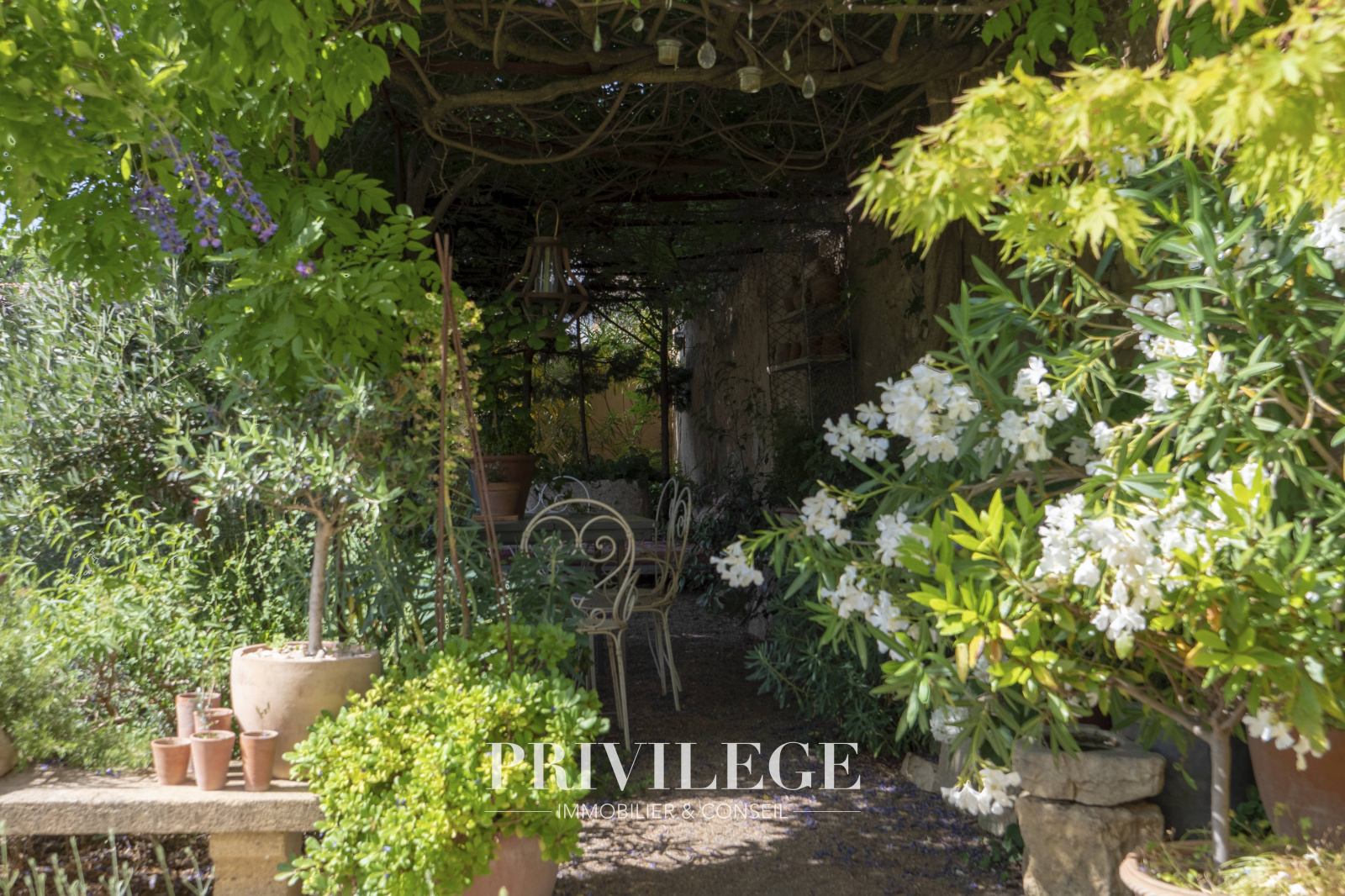 Installé confortablement à l'ombre des glycines, je vous invite à admirer ce magnifique jardin complanté d'arbres et d'arbustes d'environ 750 m2.