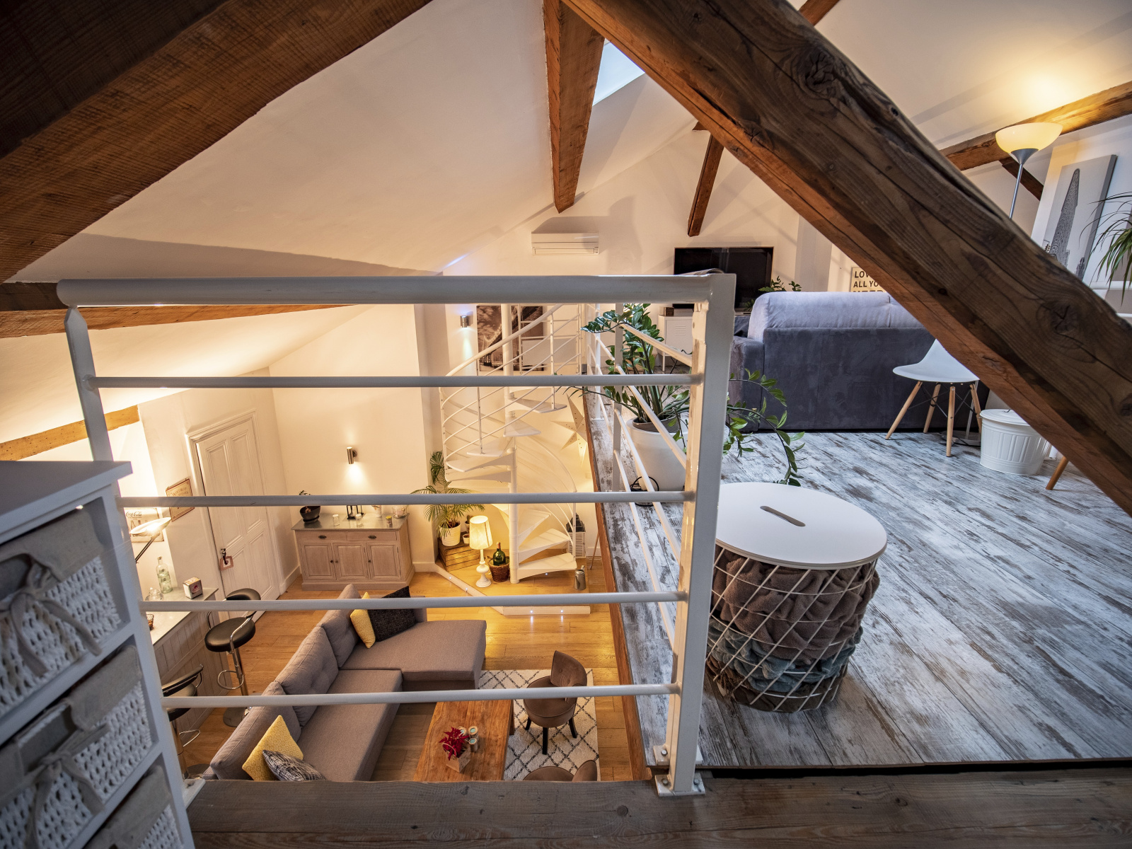 Quartier République - Tolstoï, dans une résidence sécurisée, venez découvrir ce Duplex de 98 m2 Carrez et 115 m2 en surface utile situé au dernier étage d'un immeuble Haussmannien avec ascenseur. Un Appartement de Type loft, atypique, possédant tout le charme de l'ancien, parquet massif, tomette, charpente apparente et une hauteur sous plafond offrant un volume exceptionnel ! Dès l'entrée, un dégagement vous emmène dans l'espace cuisine qui est ouvert sur une pièce de vie de plus de 45 m2 comprenant un salon et un espace salle à manger avec sa cheminée d'époque. Toujours sur le même niveau, vous trouverez une grande chambre ainsi qu'une salle de bain moderne composée d'une douche italienne et d'une grande baignoire. Dans le salon en cathédrale baigné de lumière vous pourrez profiter d'une hauteur sous plafond de plus de 4,5 m. Un escalier en fer vous permettra de profiter d'un espace complémentaire de 23 m2 Carrez (35 m2 Utile) sur le niveau supérieur avec la possibilité d'imaginer un espace parentale avec chambre, dressing + Bureau et un deuxième salon. Cet appartement est équipé d'une climatisation réversible et possède une cave fermée et sécurisée de 8 m2 environ. À proximité vous trouverez toutes les commoditées, professionnels de santé, pharmacie, supermarché et écoles ! Côté transport en commun, l'arrêt de bus C3 - Institut d'Art Contemporain est à seulment 50 m et l'arrêt de métro république est lui à 650 m. Visite virtuelle et vidéo de l'appartement sur demande.