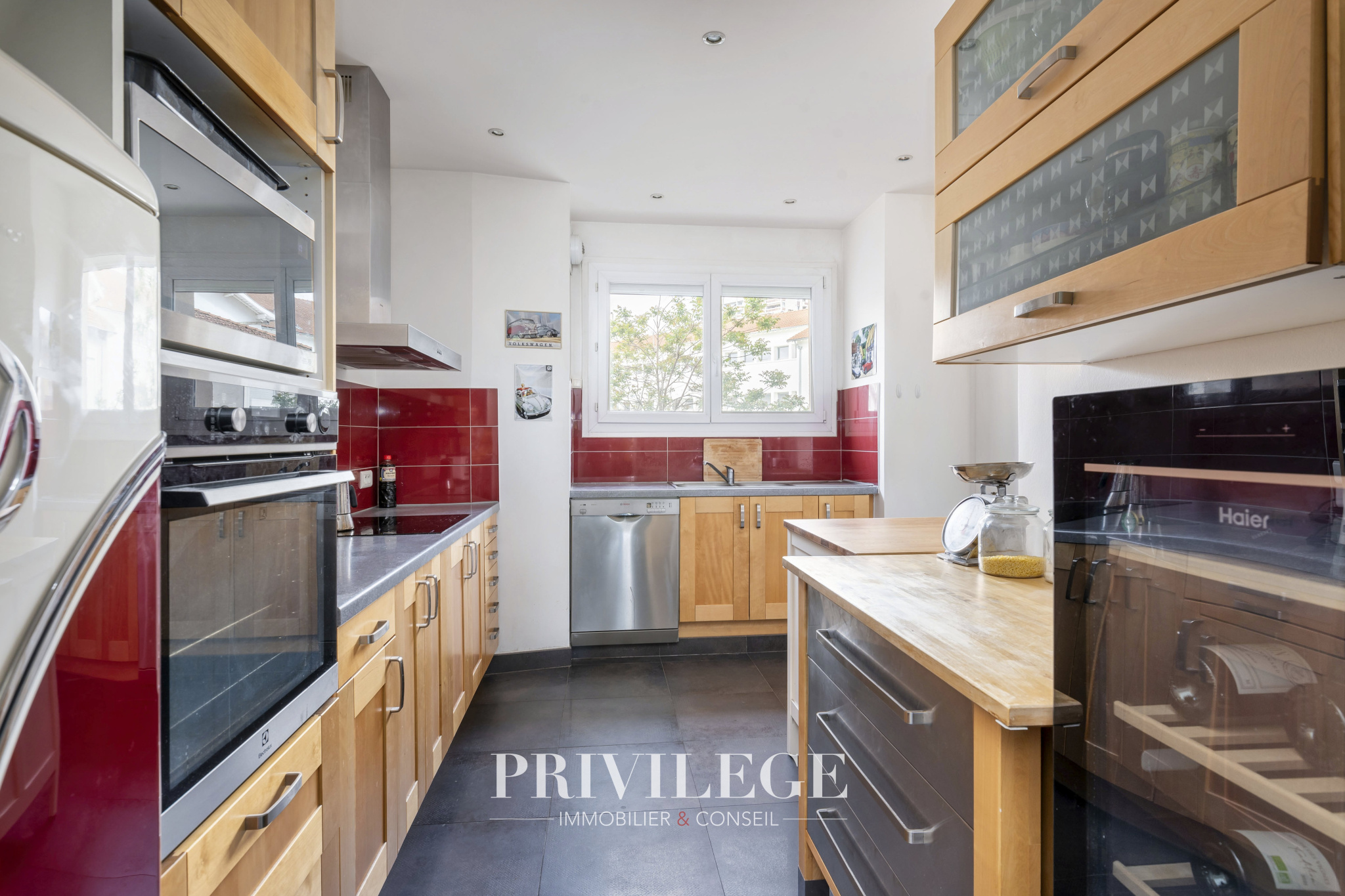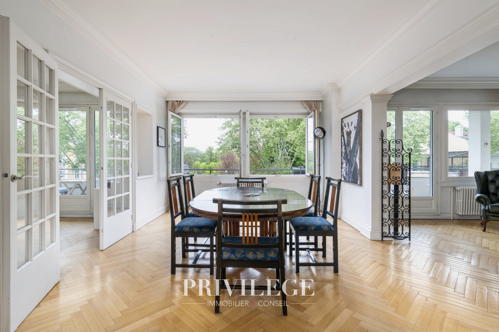 Il se compose d’un triple séjour en enfilade baigné de lumière, ainsi que d’une cuisine séparée.