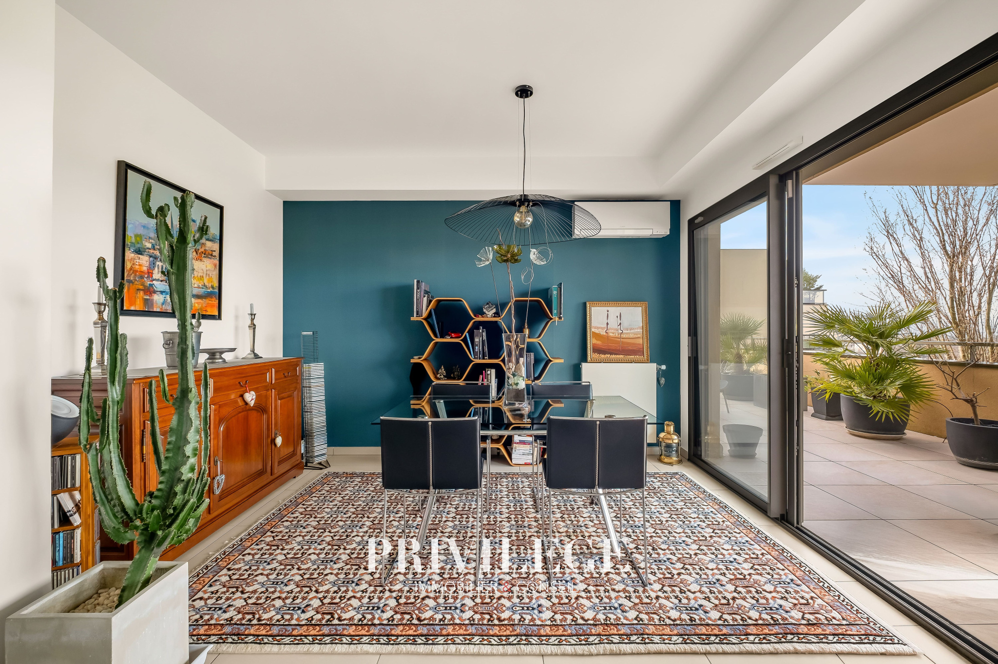 L’appartement se distingue par de larges baies vitrées dans chaque pièce, garantissant une luminosité remarquable tout au long de la journée. Les prestations assurent un confort optimal avec des brise-soleil orientables sur l’ensemble des ouvertures, un store extérieur ainsi qu’une climatisation réversible installée dans le séjour et les chambres.
