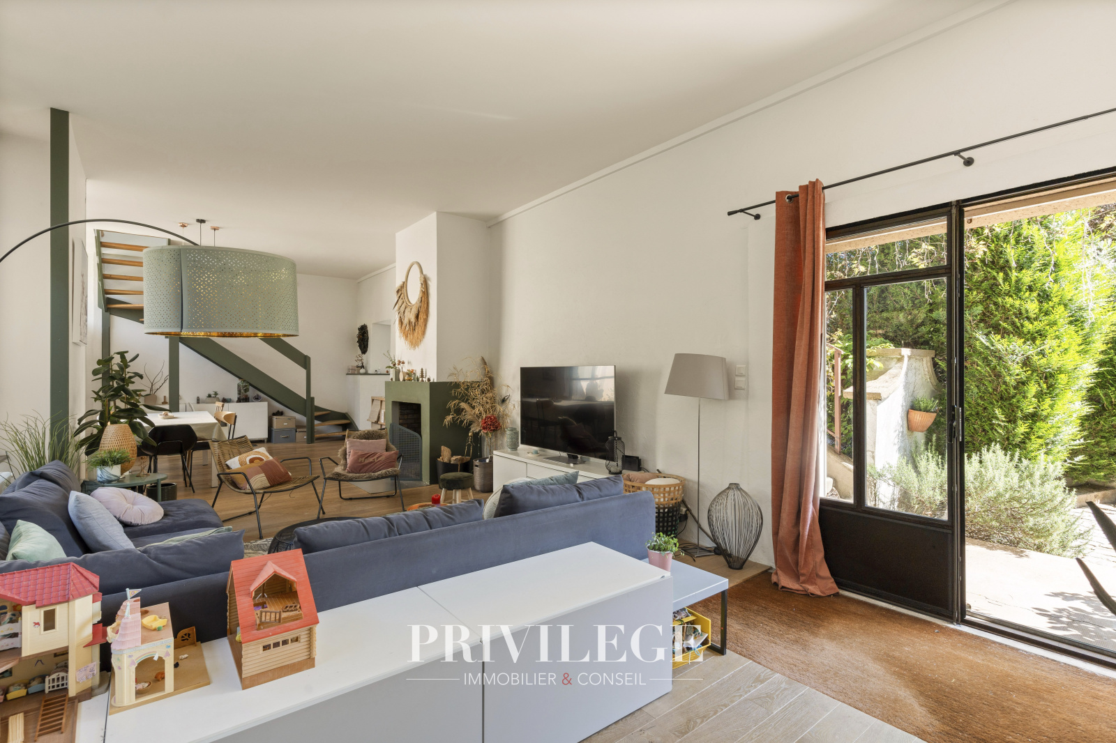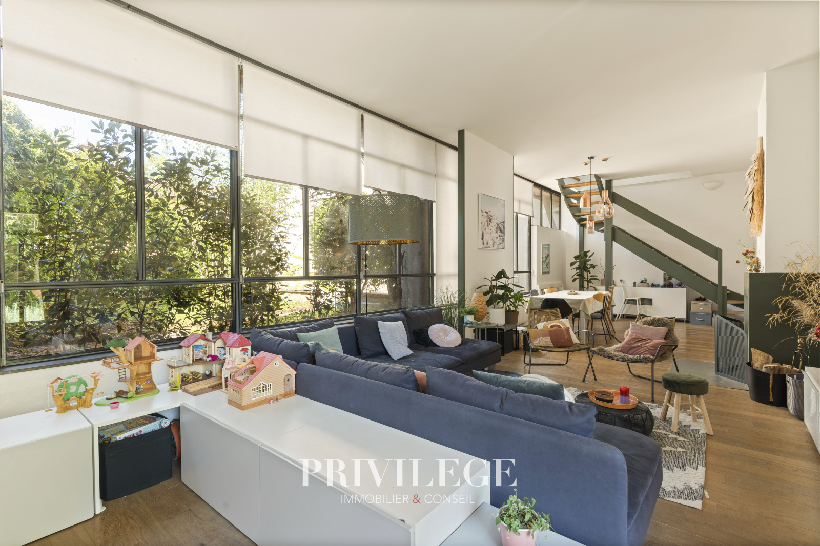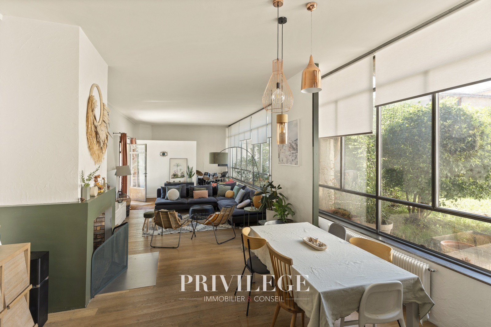Au rez-de-chaussée, vous serez séduit par un très grand séjour esprit loft avec une grandes verrières et une cheminée. Cette pièce offre un espace lumineux et convivial idéal pour les moments en famille ou entre amis.?A ce même niveau : un coin bureau fonctionnel, un vestiaire, des toilettes, une cuisine équipée s'ouvrant sur le jardin.