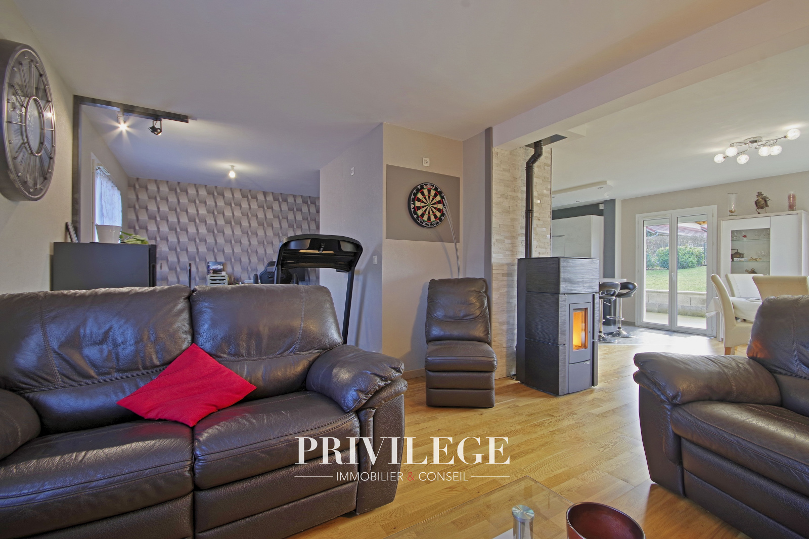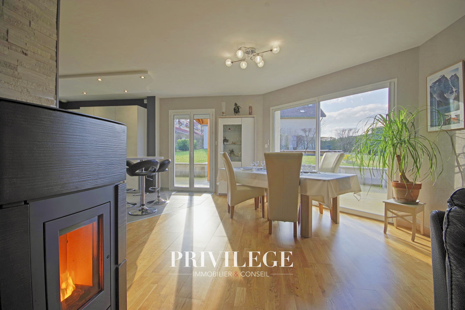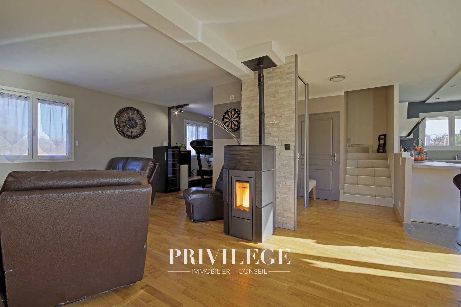 Au rez-de-jardin, vous serez séduits par une grande pièce de vie de 55 m² baignée de lumière, agrémentée d’un poêle à granulés, qui invite à des moments chaleureux en famille. La cuisine ouverte, entièrement rénovée en 2022, allie modernité et fonctionnalité pour répondre aux besoins des plus exigeants. Ce niveau comprend également un WC séparé ainsi qu’un accès direct au garage en sous-sol équipé d’une porte motorisée.