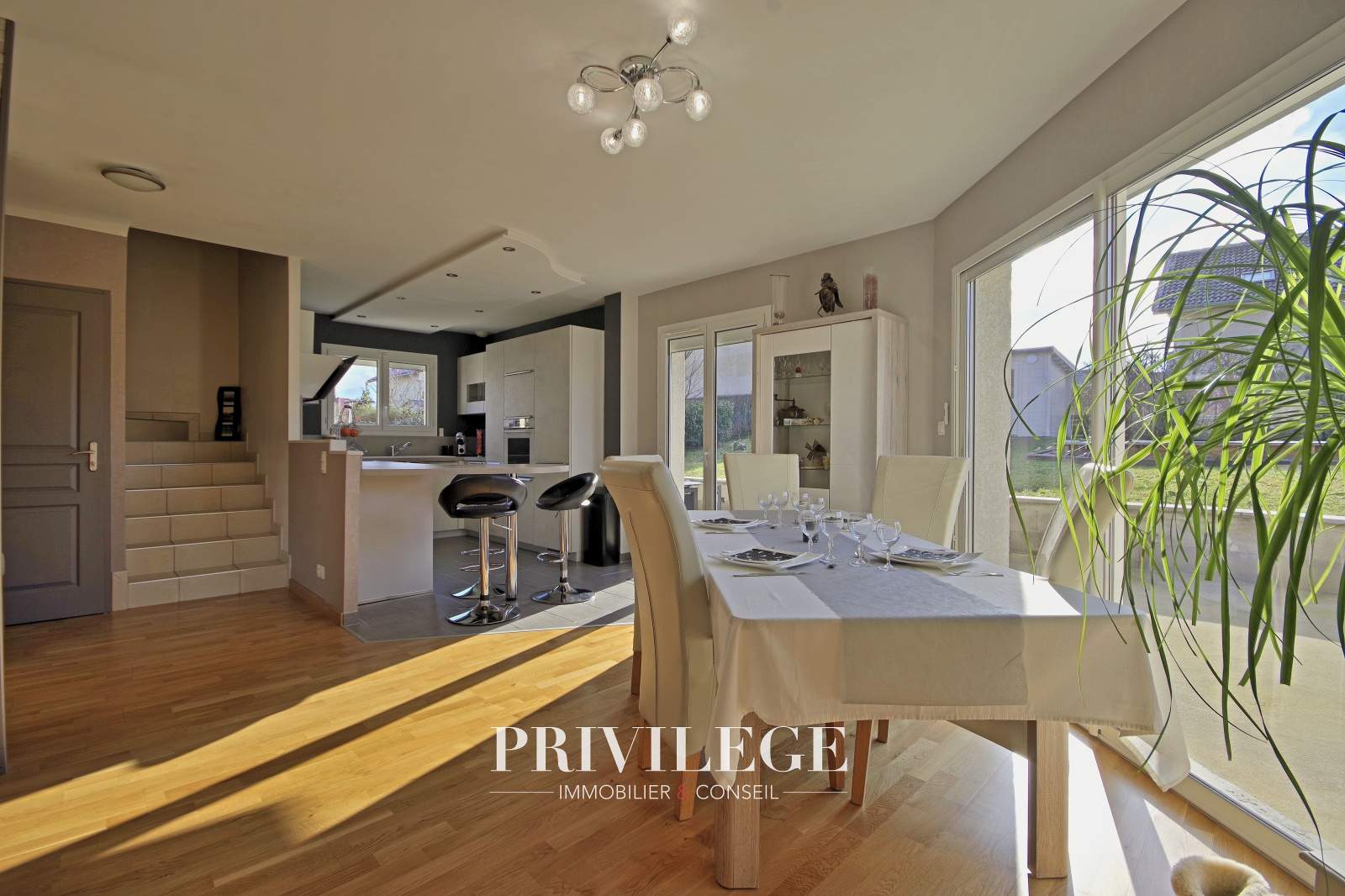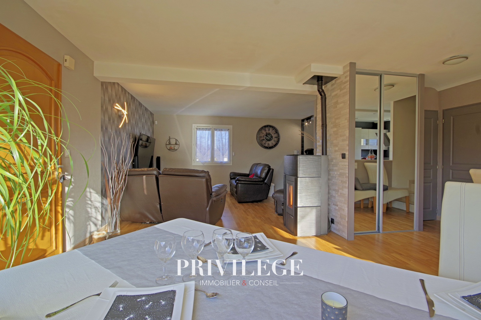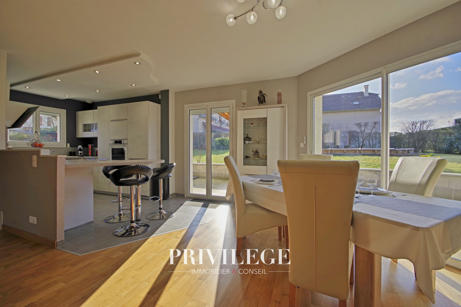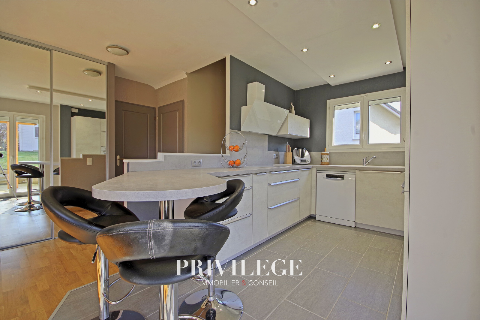 Au rez-de-jardin, vous serez séduits par une grande pièce de vie de 55 m² baignée de lumière, agrémentée d’un poêle à granulés, qui invite à des moments chaleureux en famille. La cuisine ouverte, entièrement rénovée en 2022, allie modernité et fonctionnalité pour répondre aux besoins des plus exigeants. Ce niveau comprend également un WC séparé ainsi qu’un accès direct au garage en sous-sol équipé d’une porte motorisée.