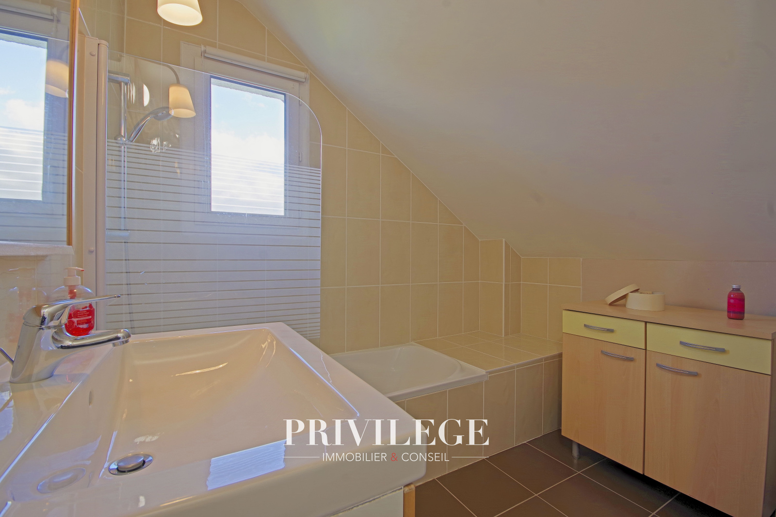 À l’étage, la maison propose deux chambres lumineuses et confortables ainsi qu’une suite parentale avec salle d’eau privative. Une salle de bains supplémentaire avec WC complète ce niveau, offrant tout le confort nécessaire à votre famille. Toutes les fenêtres de la maison sont équipées de volets roulants, garantissant un excellent confort thermique et une parfaite tranquillité.