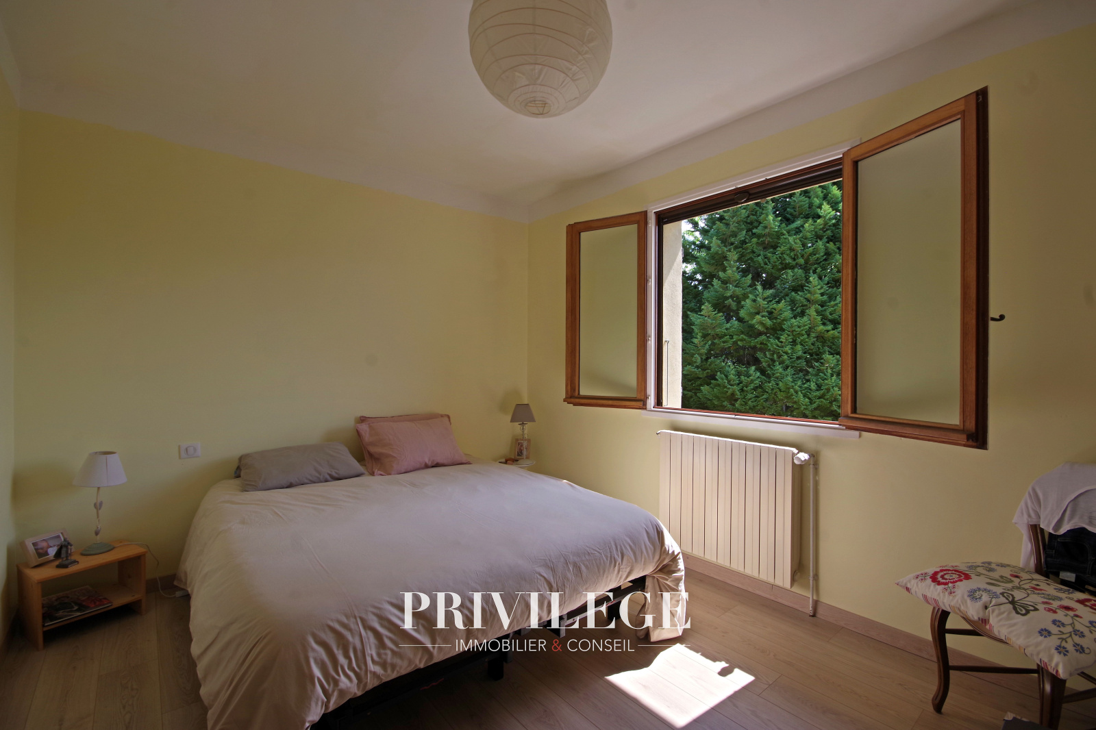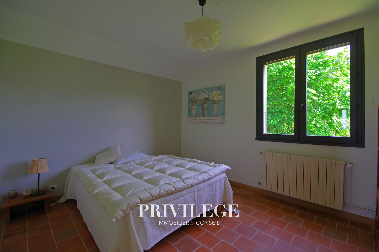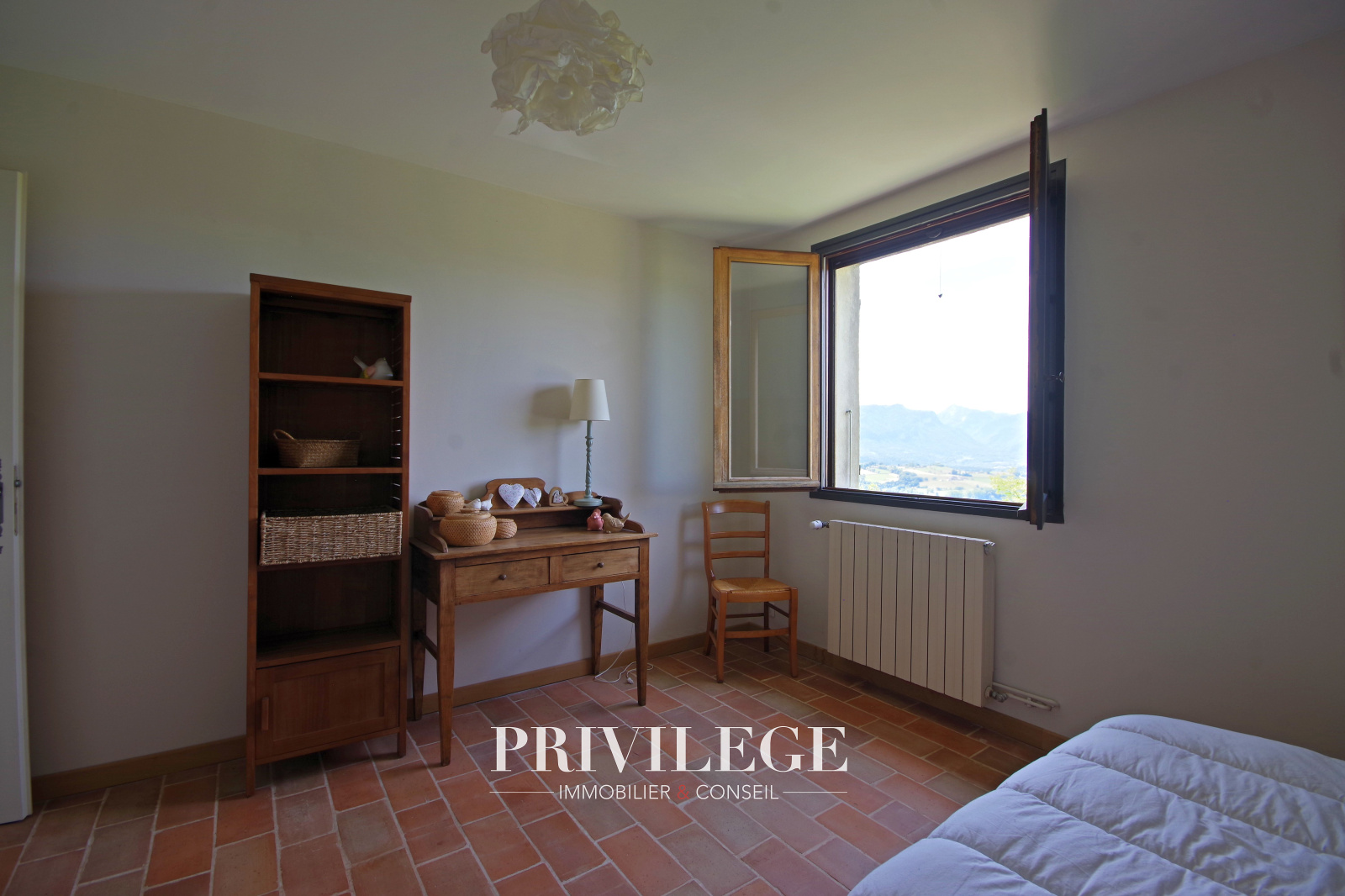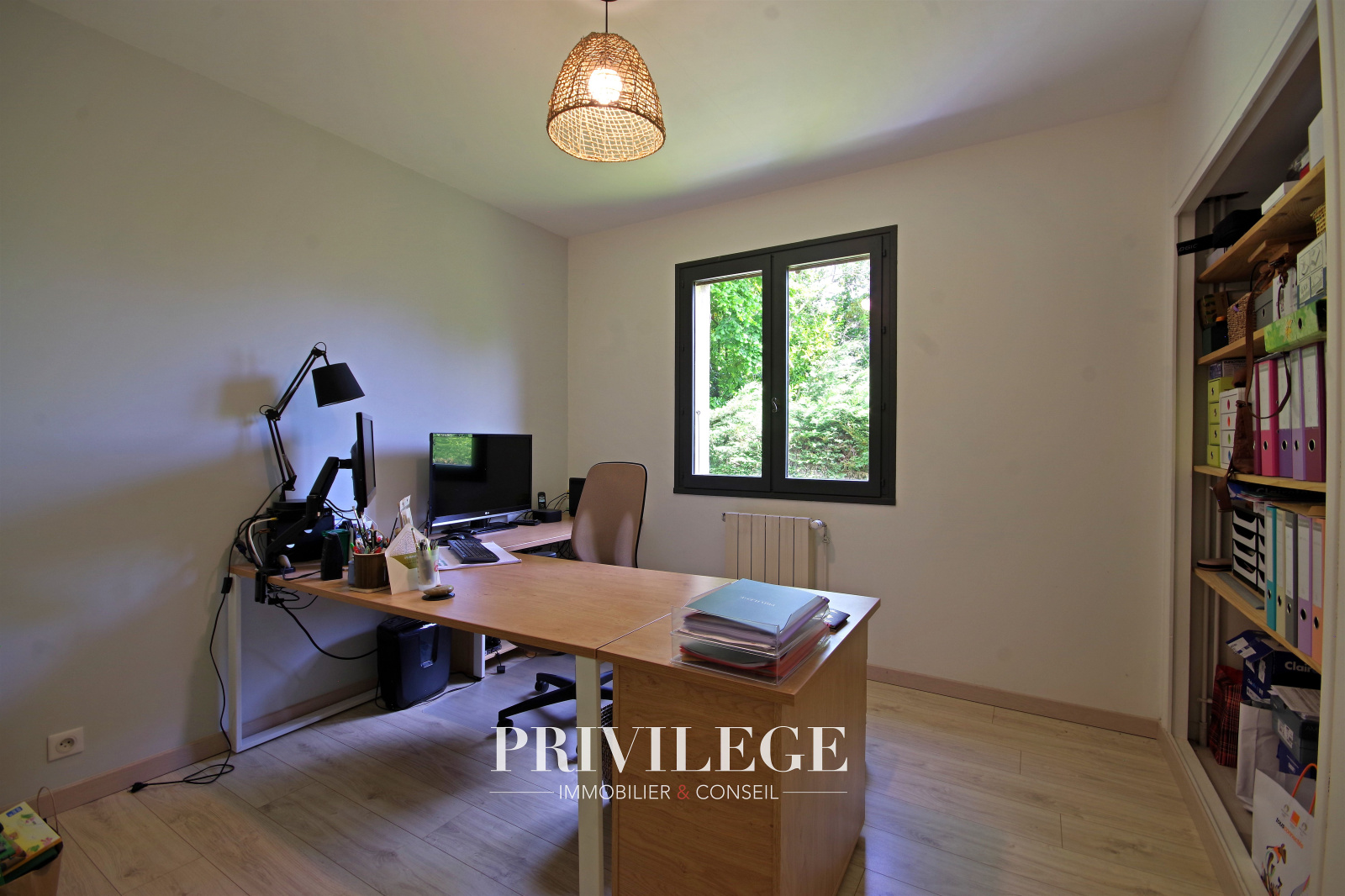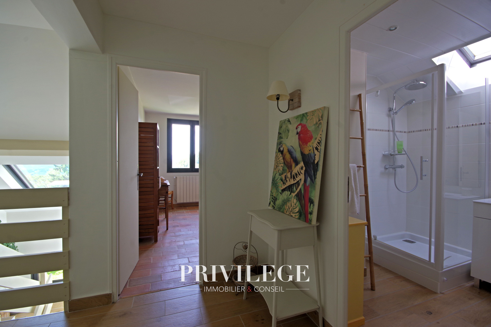 Idéalement implantée sur un vaste terrain arboré de 3600m², soigneusement entretenu, elle se compose d’un rez-de-chaussée accueillant un salon/séjour lumineux avec balcon exposé Est et une jolie vue dégagée sur les plaines environnantes. La cuisine séparée et entièrement équipée permet un usage fonctionnel au quotidien. Ce niveau comprend également un bureau, deux chambres confortables, une salle de bains et un WC.