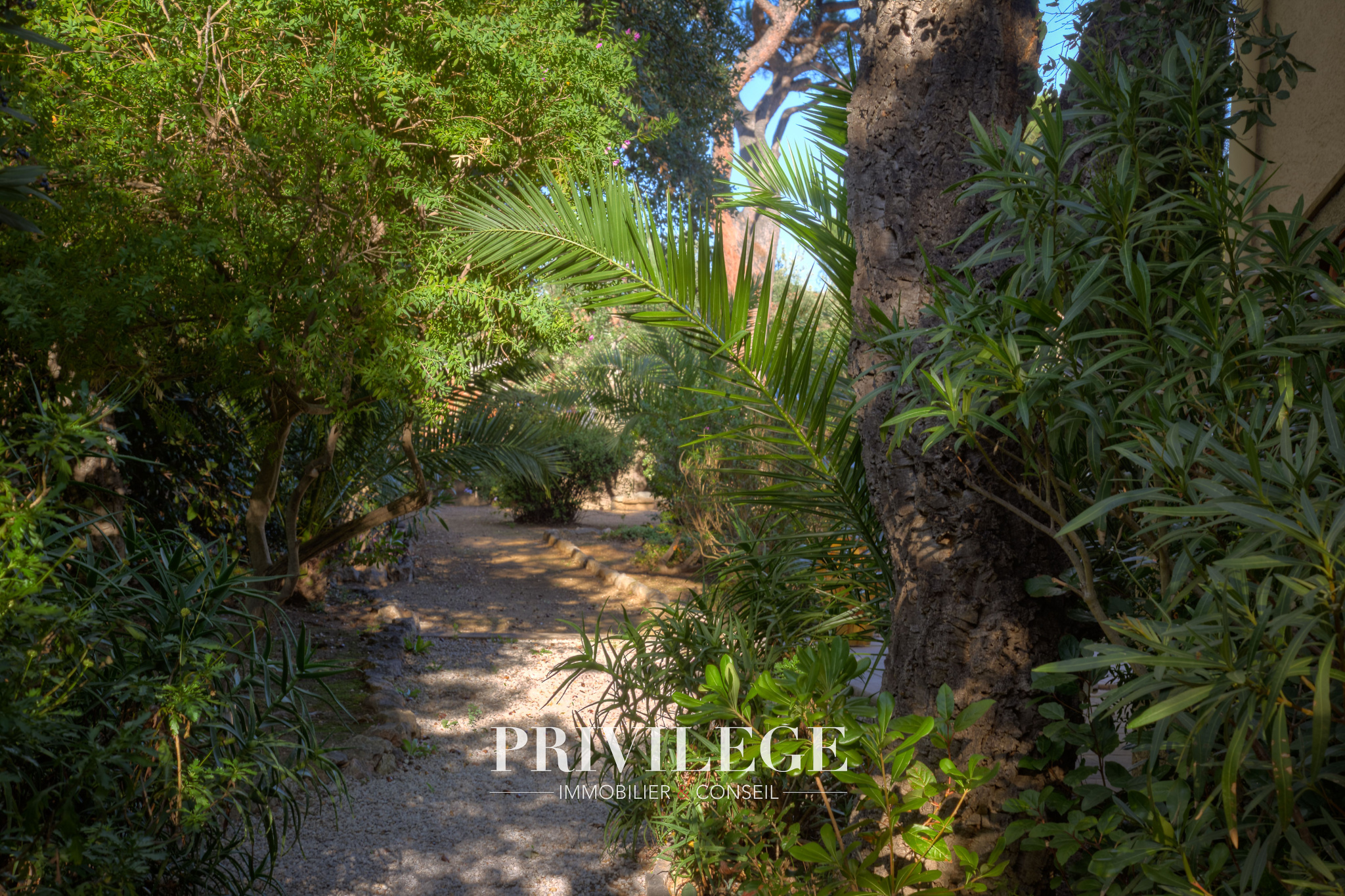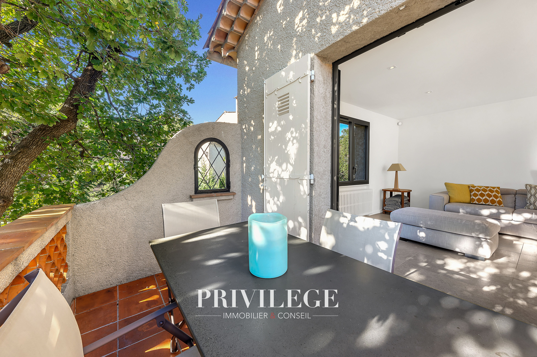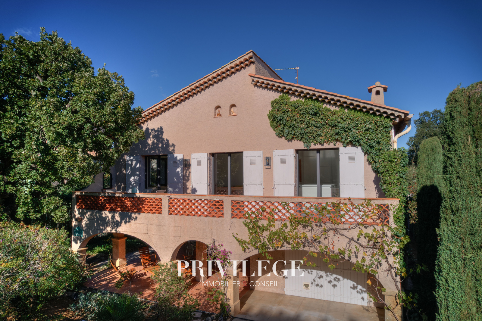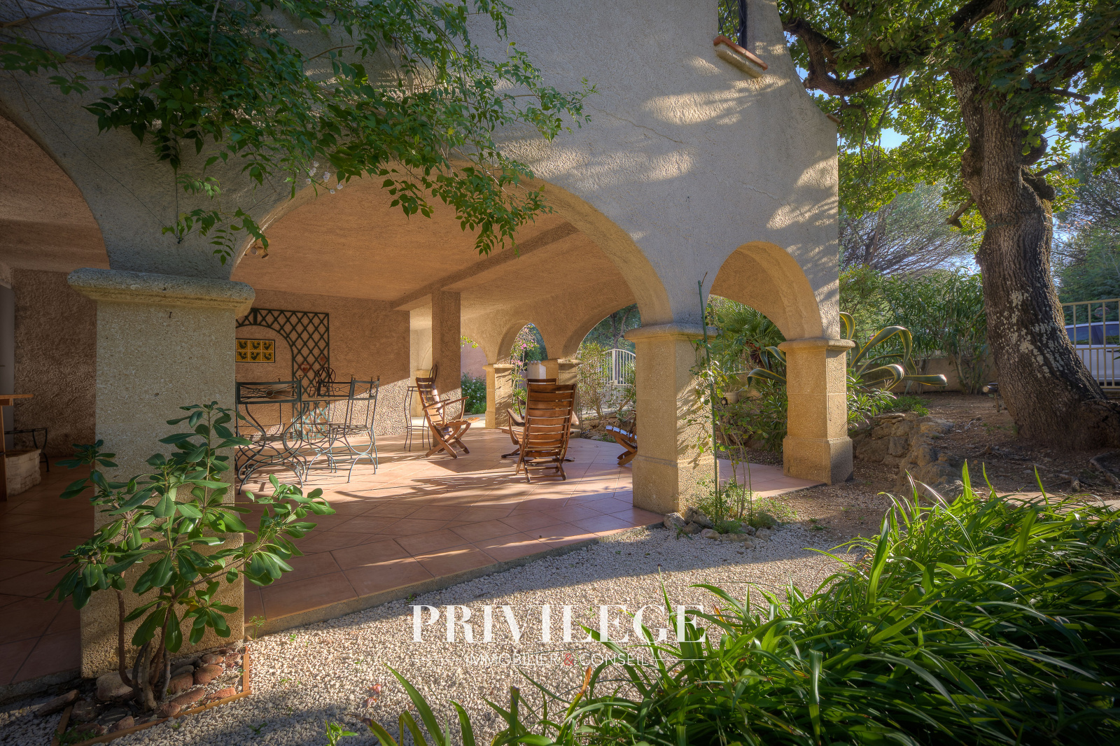 Les extérieurs sont soigneusement aménagés : plusieurs terrasses invitent à la détente, dont une vaste terrasse couverte, idéale pour les repas en famille ou entre amis, dans un jardin arboré et parfumé d’essences méditerranéennes.