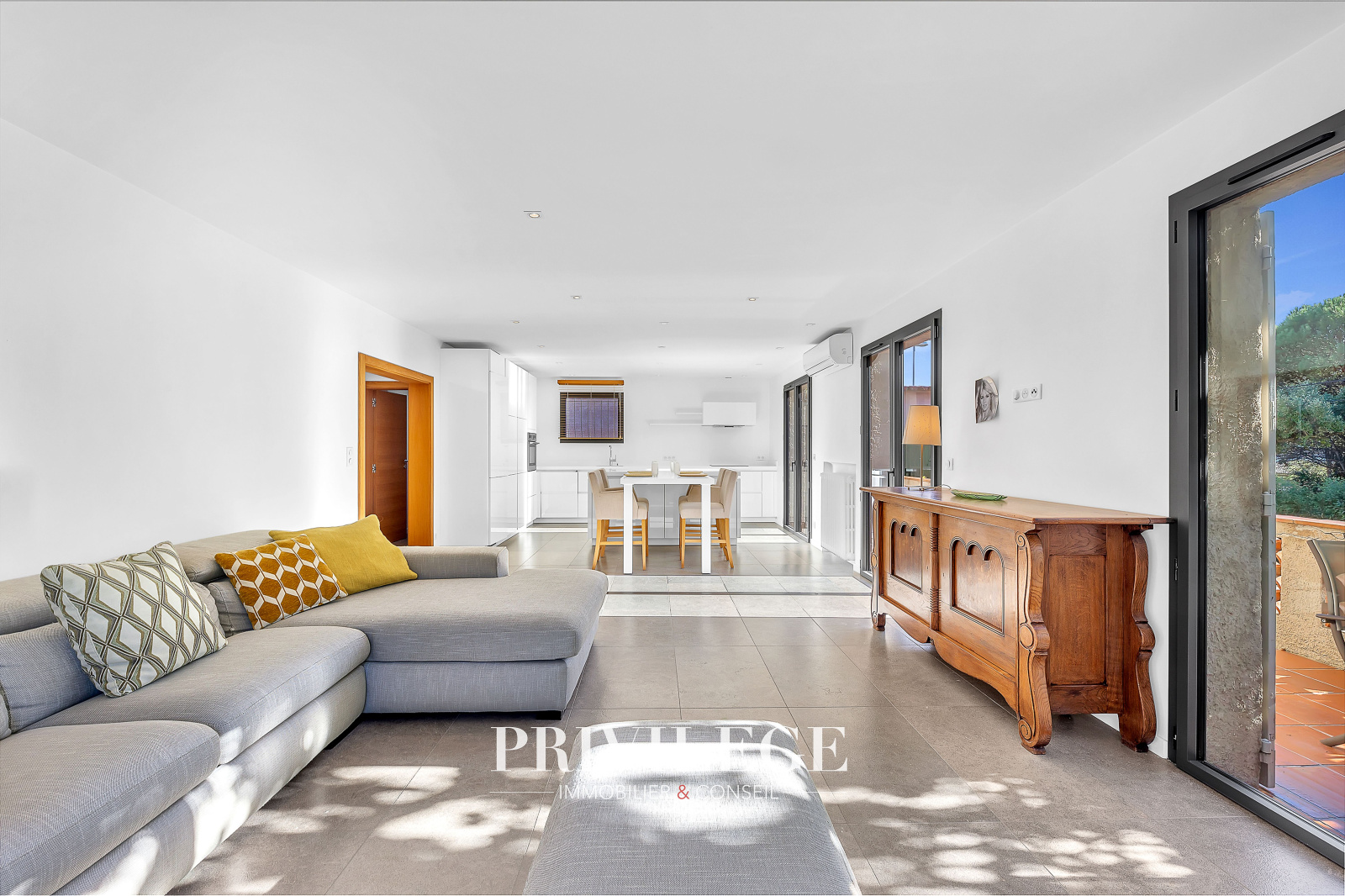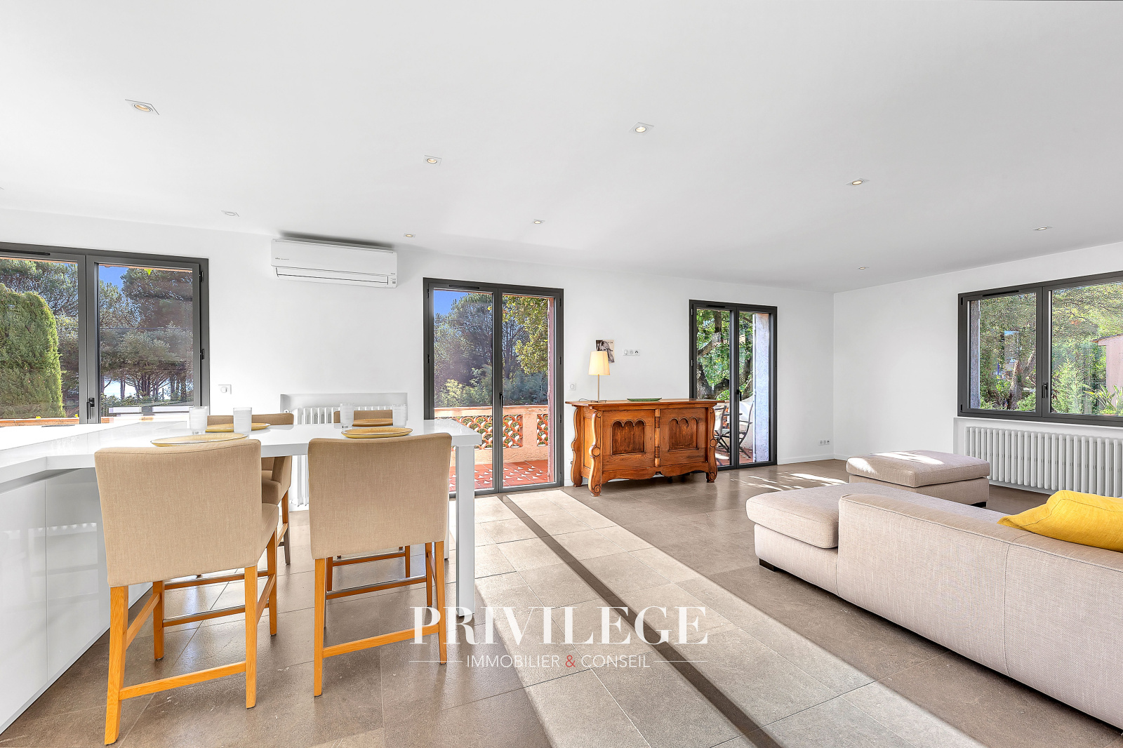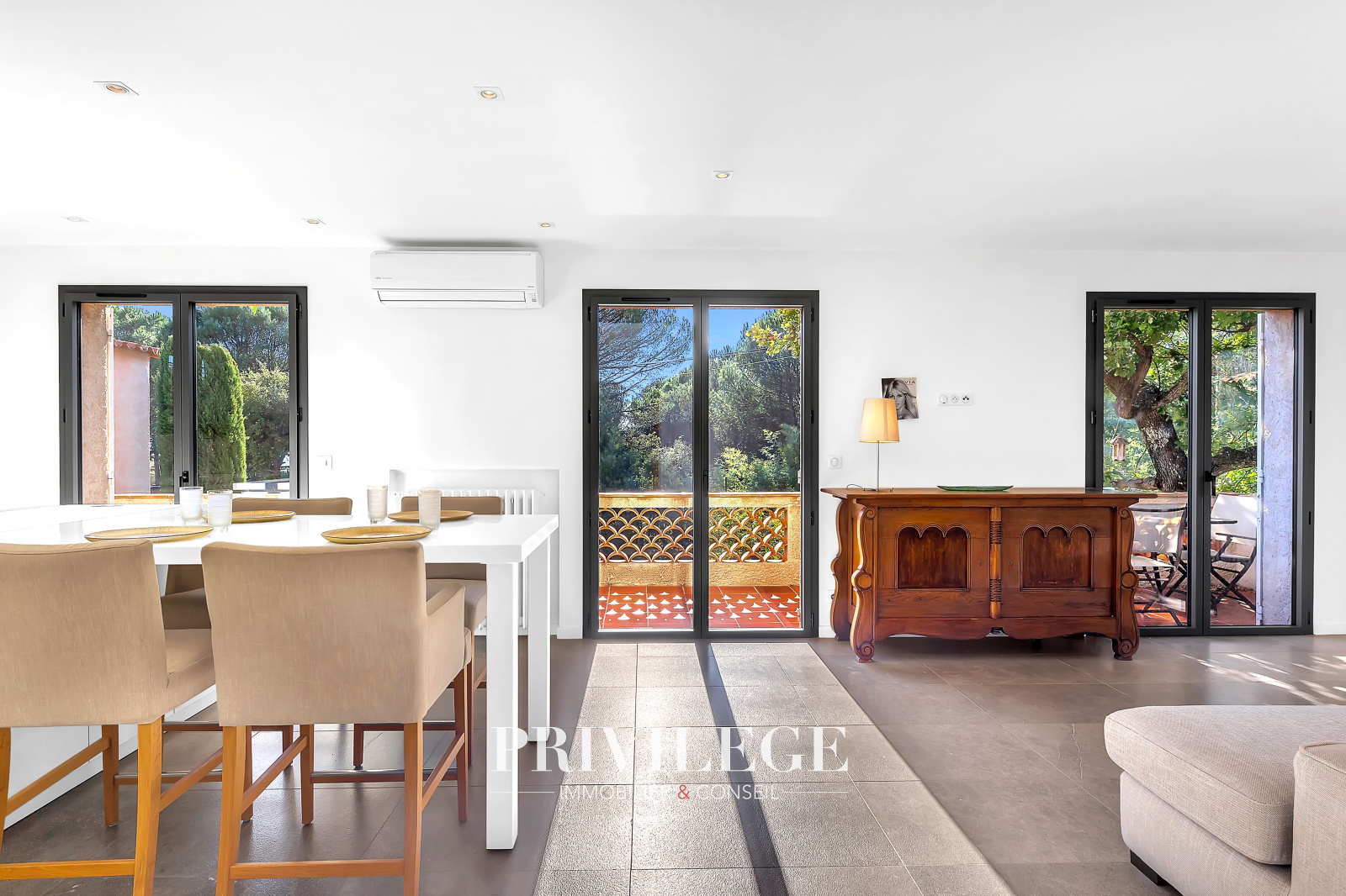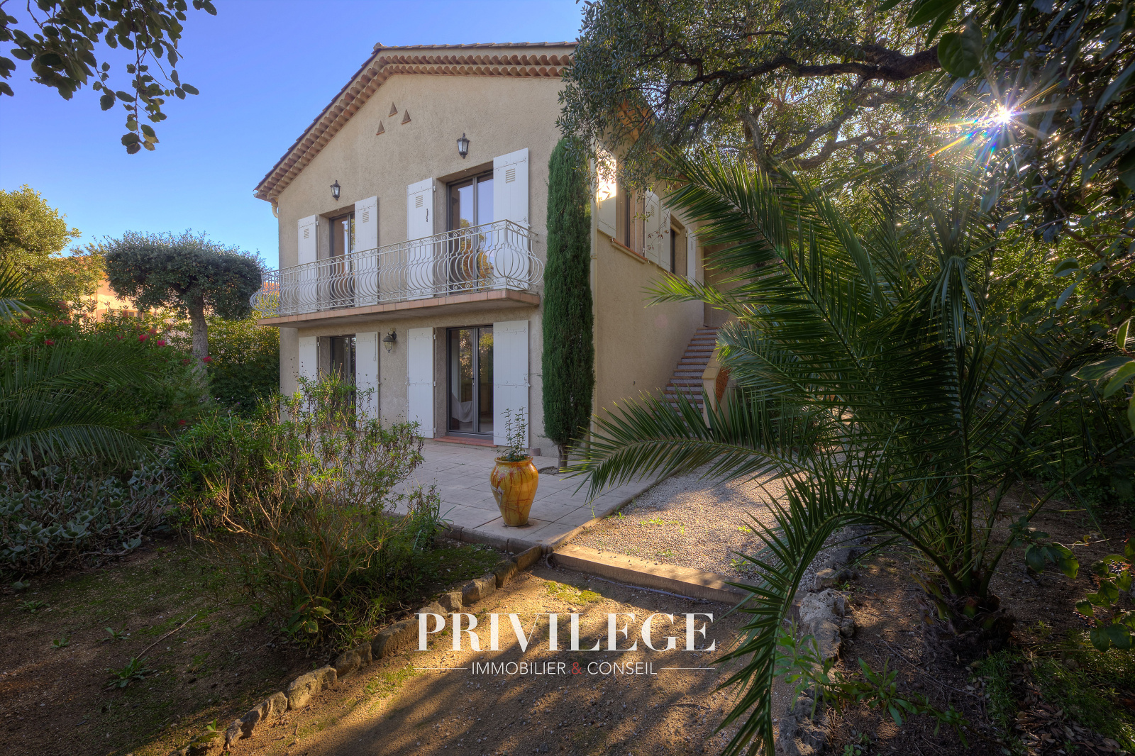 Les extérieurs sont soigneusement aménagés : plusieurs terrasses invitent à la détente, dont une vaste terrasse couverte, idéale pour les repas en famille ou entre amis, dans un jardin arboré et parfumé d’essences méditerranéennes.